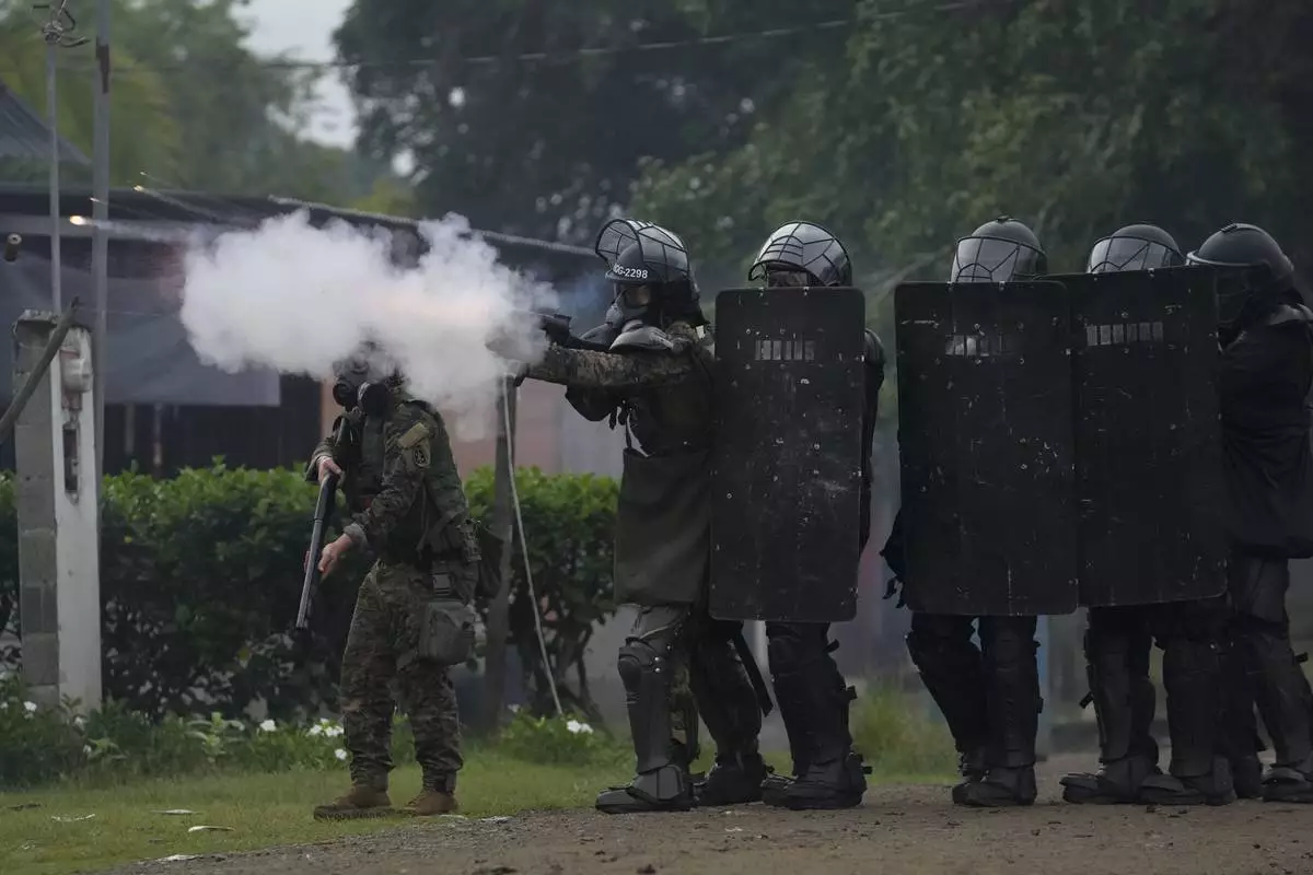Police fire tear gas at anti-government protesters blocking the Pan-American Highway in the Embera Indigenous community of Arimae, Panama, Thursday, June 5, 2025. (AP Photo/Matias Delacroix)
