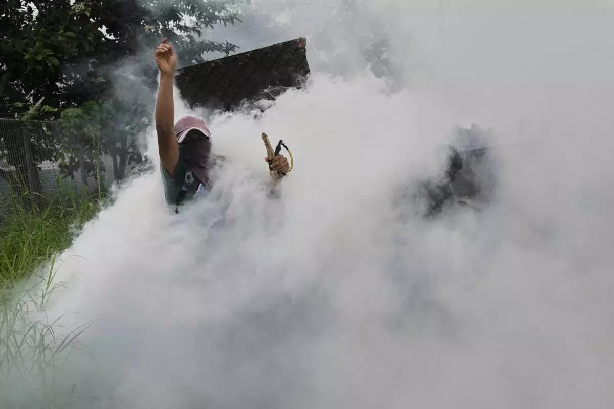 Tear gas enugulf anti-government protesters as they clash with police at the Indigenous Embera community of Arimae, Panama, Thursday, June 5, 2025. (AP Photo/Matias Delacroix)