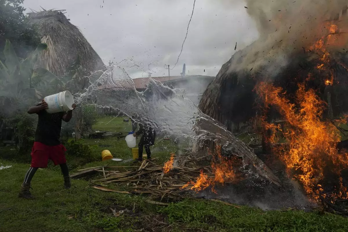 Residents try to extinguish a hut that caught fire during clashes between anti-government protesters and police in the Indigenous Embera community of Arimae, Panama, Thursday, June 5, 2025. (AP Photo/Matias Delacroix)