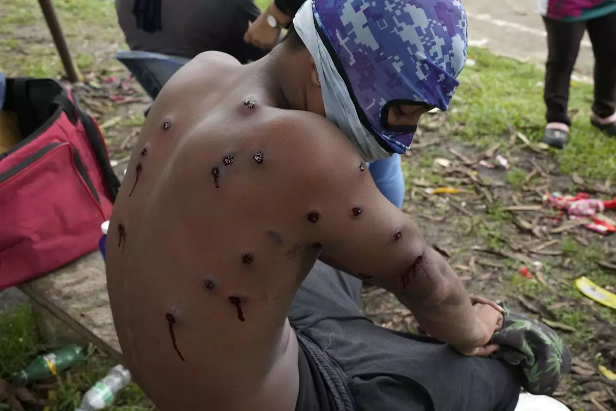An anti-government protester shows pellet wounds sustained during clashes with police in the Indigenous Embera community of Arimae, Panama, Thursday, June 5, 2025. (AP Photo/Matias Delacroix)