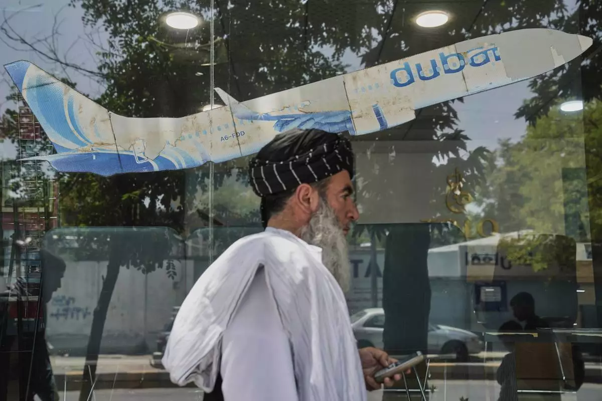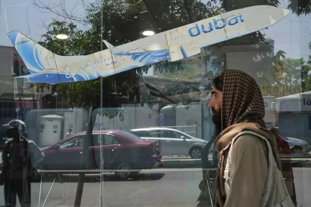An Afghan man passes in front of an air travel agency in Kabul, Afghanistan, Thursday, June 5, 2025. (AP Photo/Ebrahim Noroozi)