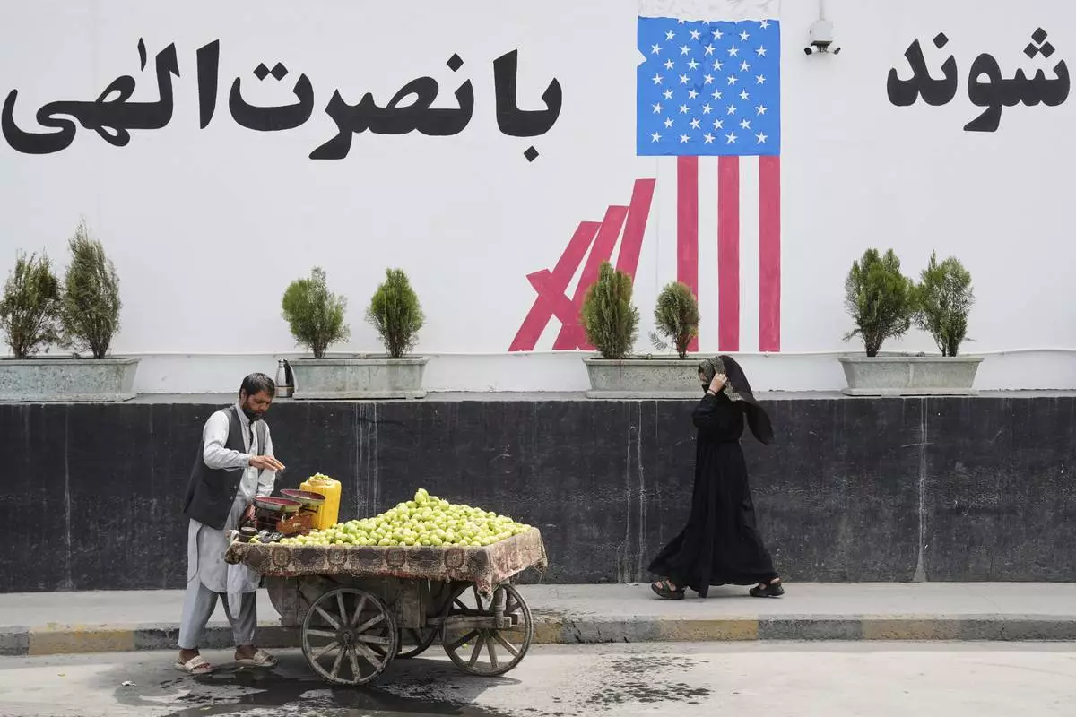 A vendor waits for customers in front of the former US embassy in Kabul, Afghanistan, Thursday, June 5, 2025. (AP Photo/Ebrahim Noroozi)