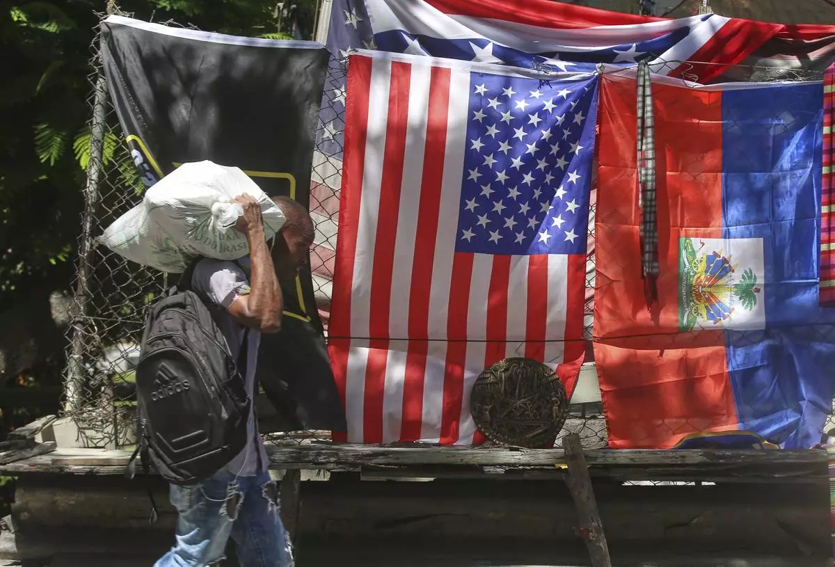 A man walks past a vendor's stall selling U.S. and Haitian flags in Port-au-Prince, Haiti, Thursday, June 5, 2025. (AP Photo/Odelyn Joseph)
