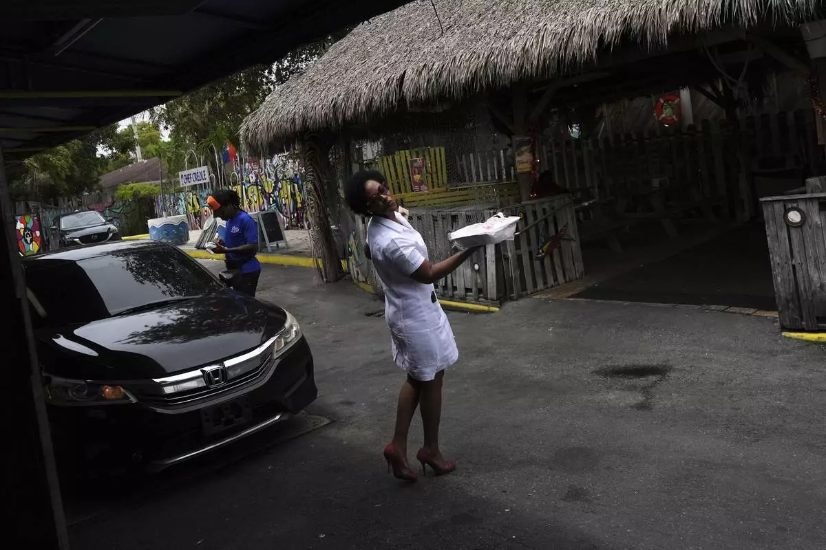 Yvette Chatelain, a sales rep for Haitian food products, strikes a pose as she leaves with her meal, at Chef Creole restaurant in Miami's Little Haiti neighborhood, Thursday, June 5, 2025. (AP Photo/Rebecca Blackwell)