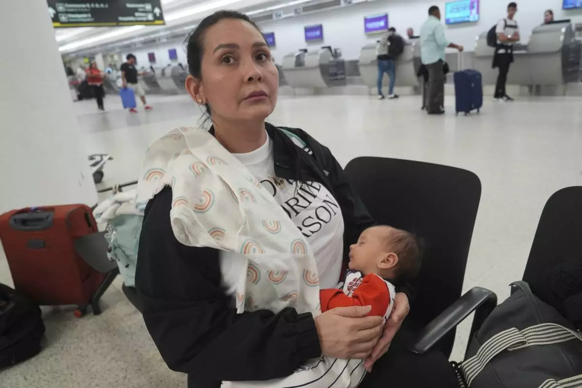 Orelves Gonzalez holds her son Esteban Guilarte, as she listens to updates on her flight back to Venezuela, Thursday, June 5, 2025, at Miami International Airport. Gonzalez has a multiyear tourist visa but is afraid she might not be able to see her family in the U.S. for many years. (AP Photo/Marta Lavandier)