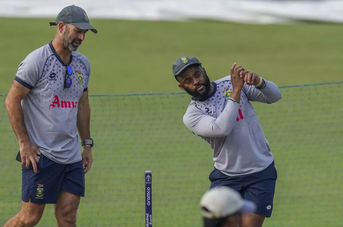 FILE - From left, South Africa's head coach Rob Walter watches captain Temba Bavuma shadow batting during a practice prior to their semi-final match in ICC Men's Cricket World Cup against Australia in Kolkata, India, Nov. 15, 2023. (AP Photo/Bikas Das, File)