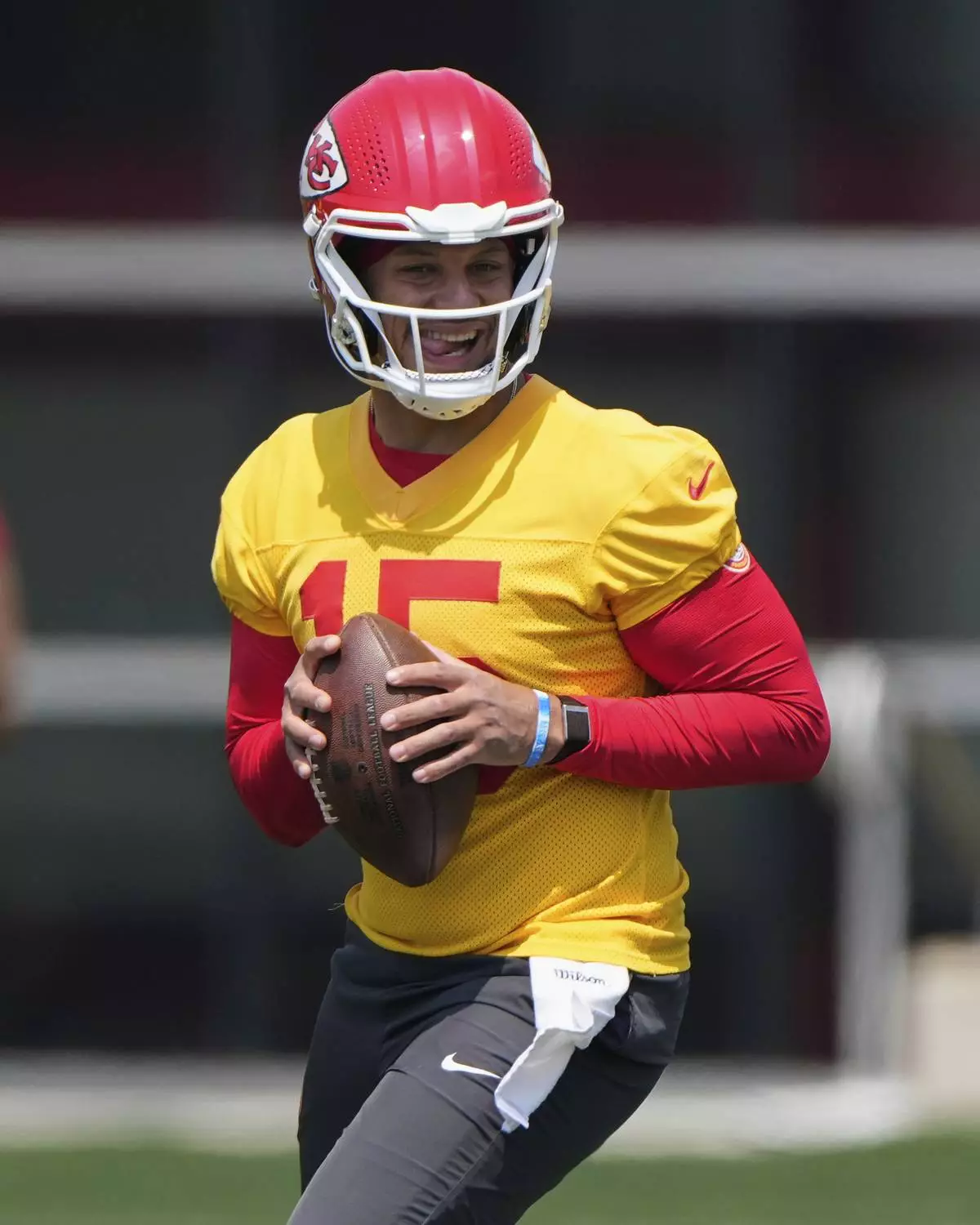 Kansas City Chiefs quarterback Patrick Mahomes looks to pass during the NFL football team's organized team activities Wednesday, June 4, 2025, in Kansas City, Mo. (AP Photo/Charlie Riedel)