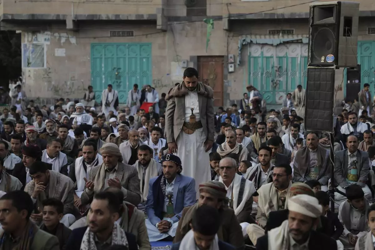 Muslims attend prayers on the first day of Eid al-Adha, outside a mosque in Sanaa, Yemen, Friday, June 6, 2025.(AP Photo/Osamah Abdulrahman)