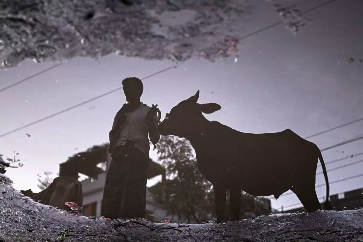 A vendor at a livestock market is reflected in a pool of water as he waits for customers ahead of the Muslim festival of Eid al-Adha, in Dhaka, Bangladesh, Thursday, June 5, 2025. (AP Photo/Mahmud Hossain Opu)