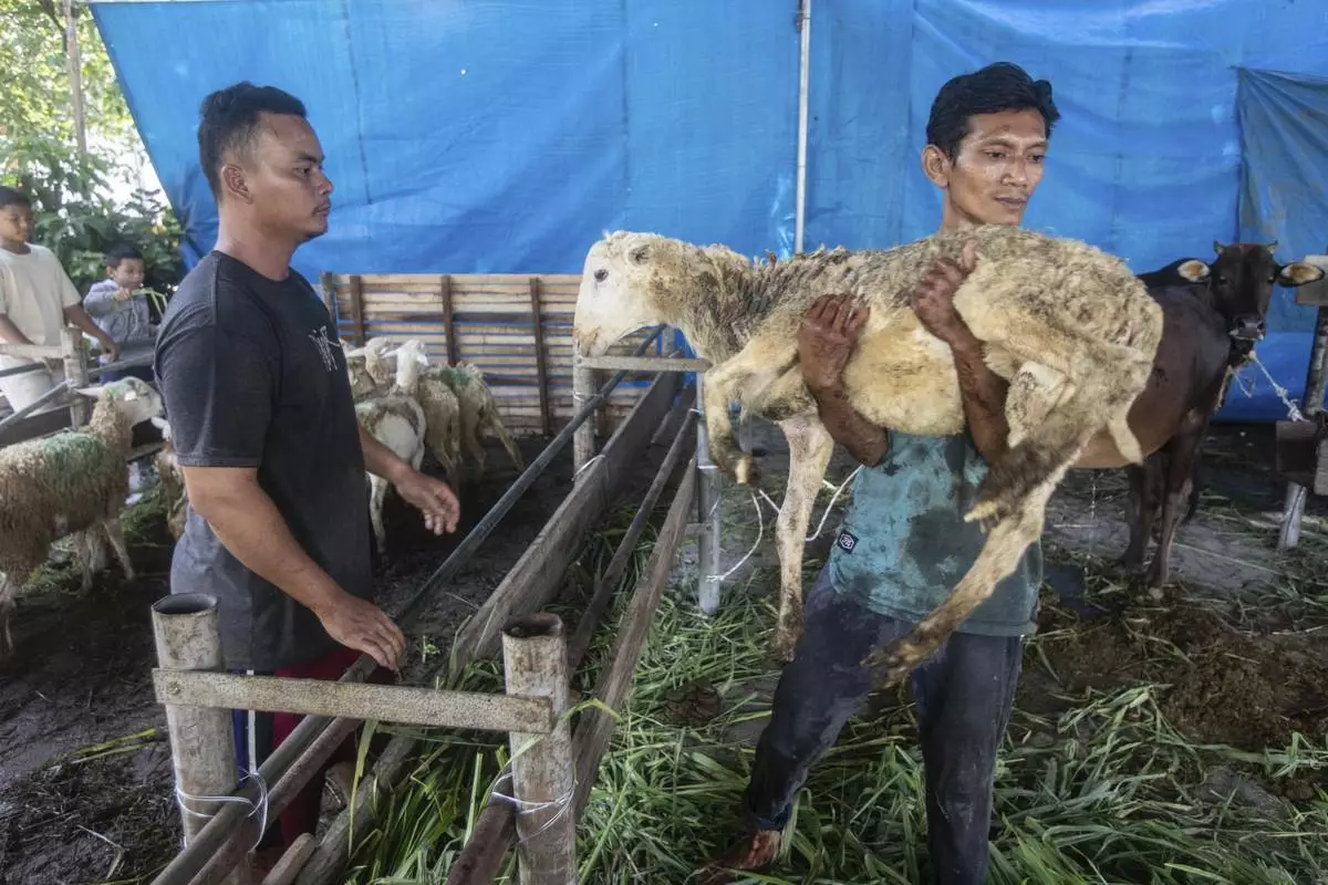 A worker carries a sheep to be slaughtered whose meat later distributed to the poor, during the celebration of Eid al-Adha, or the Feast of the Sacrifice, at Aljihad Mosque in Medan, North Sumatra, Indonesia, Friday, June 6, 2025. (AP Photo/Binsar Bakkara)