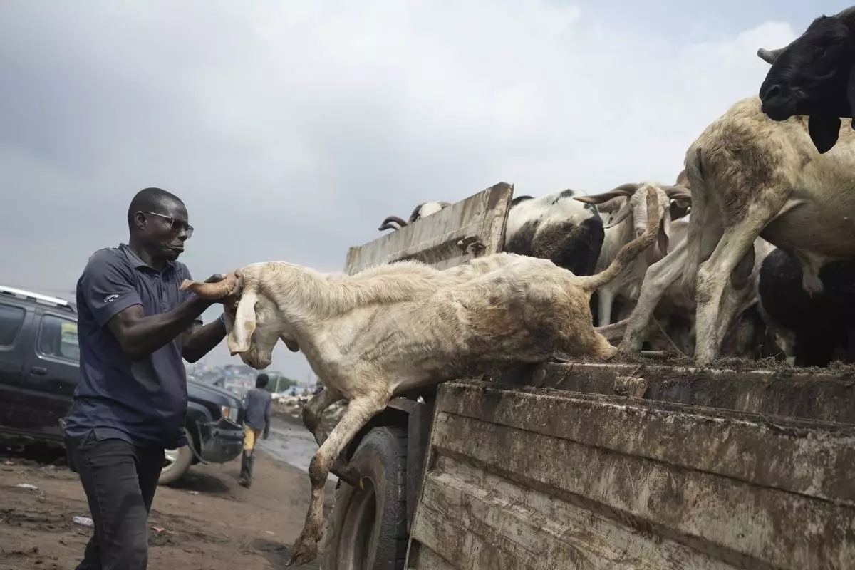 A worker offloads a ram from a truck to be sold ahead of Eid Al-Adha celebrations at Kara market in Ogun South west Nigeria, Thursday, June 5, 2025. (AP Photo/Sunday Alamba)