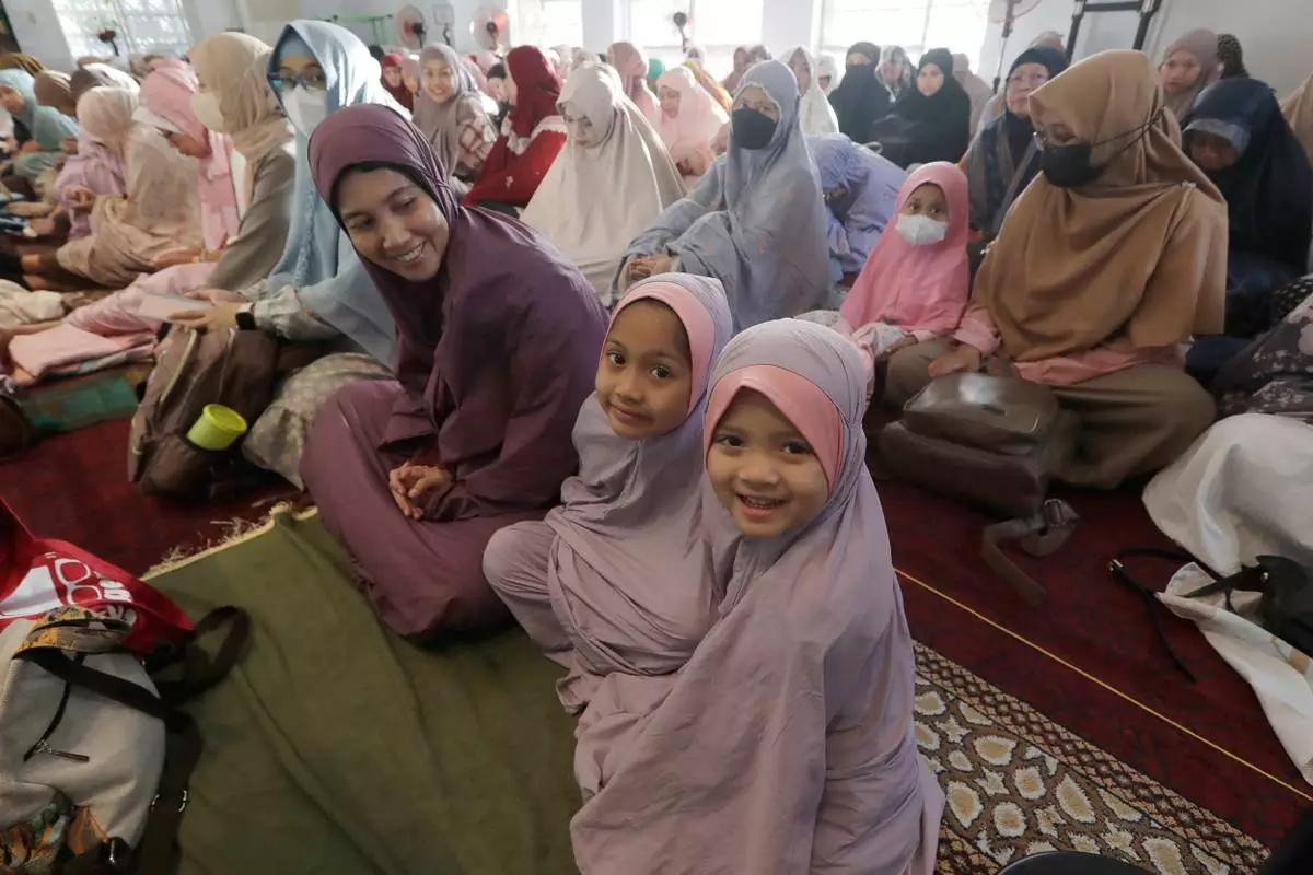 Muslims wait to pray during the Eid al-Adha prayers at Taipei Grand Mosque in Taipei, Taiwan, Friday, June 6, 2025. (AP Photo/Chiang Ying-ying)