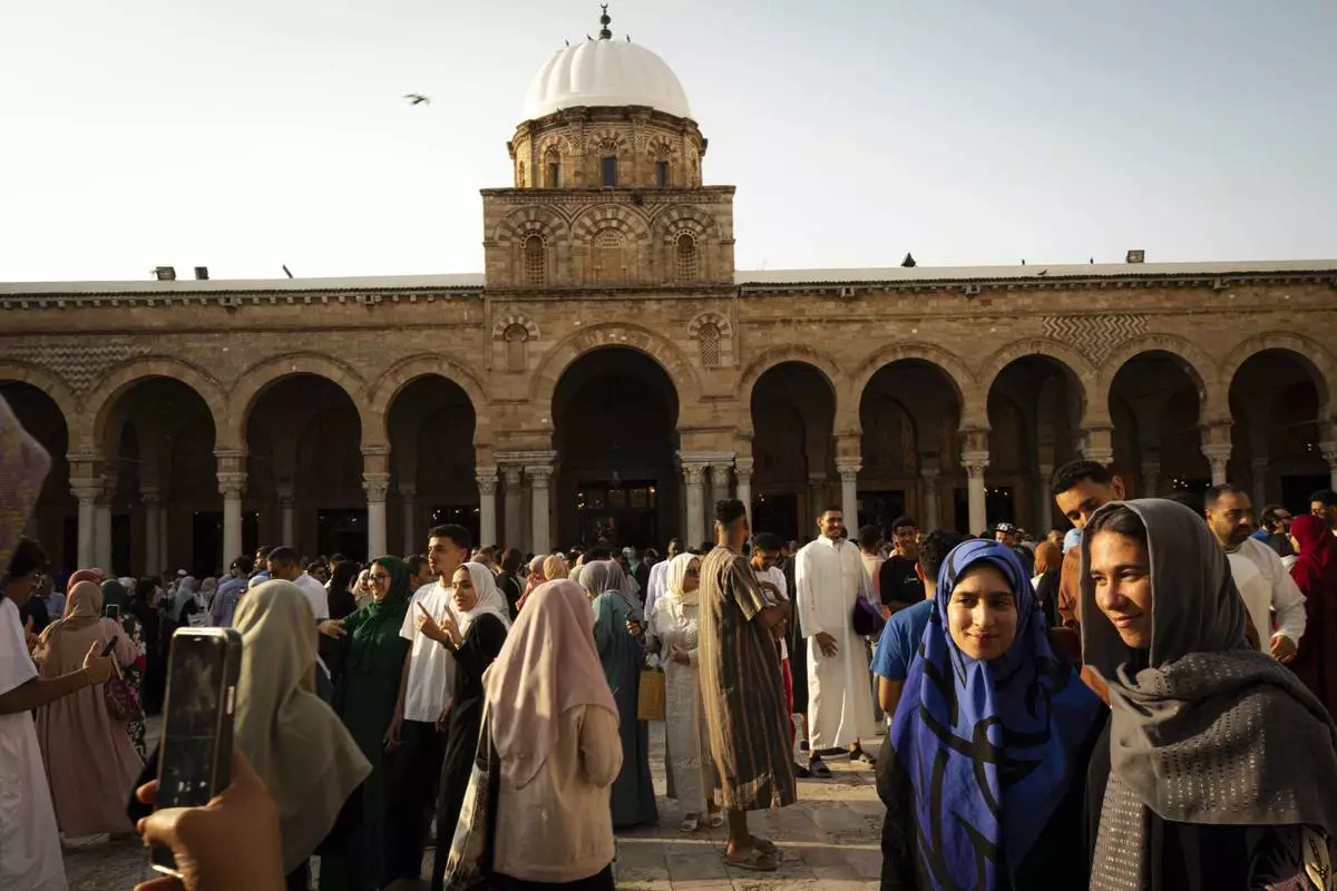 Muslims gather to perform Eid al-Adha prayers at Zaytuna Mosque in Tunis, Tunisia, Friday, June 6, 2025. (AP Photo/Anis Mili)