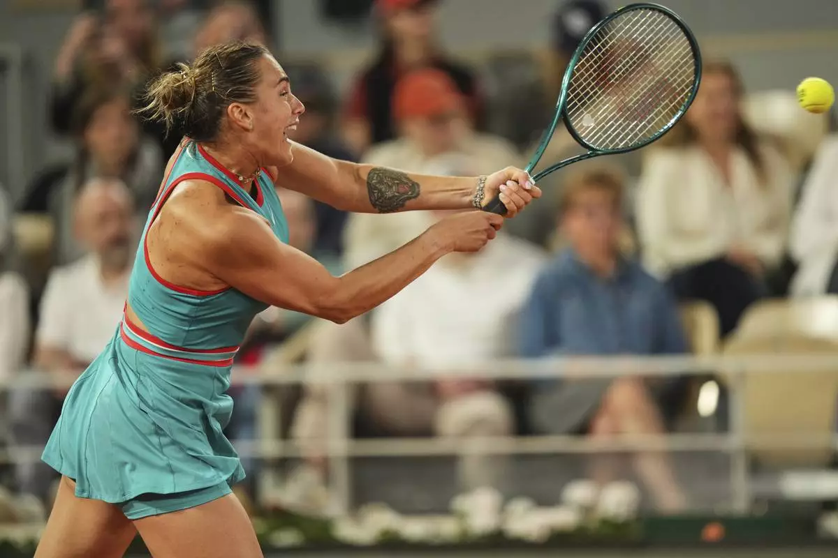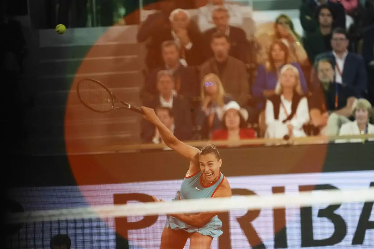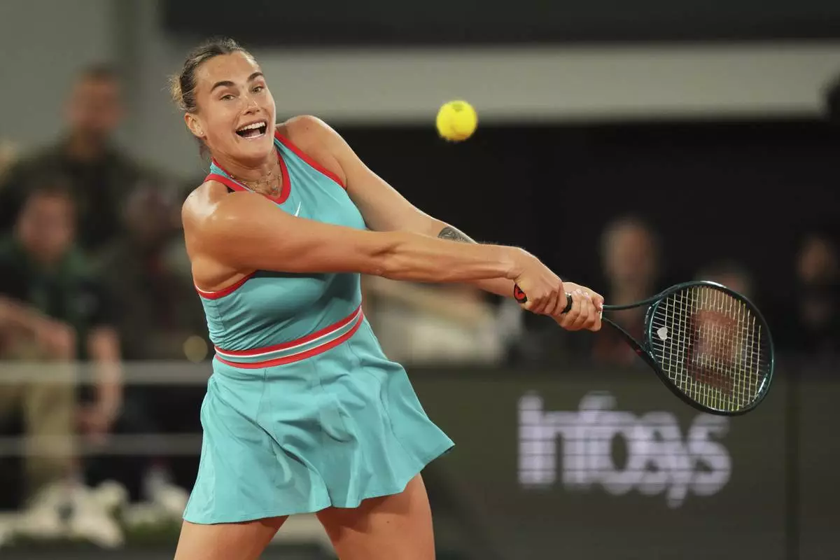 Aryna Sabalenka of Belarus plays a shot against Poland's Iga Swiatek during their semifinal match of the French Tennis Open at the Roland-Garros stadium in Paris, Thursday, June 5, 2025. (AP Photo/Thibault Camus)