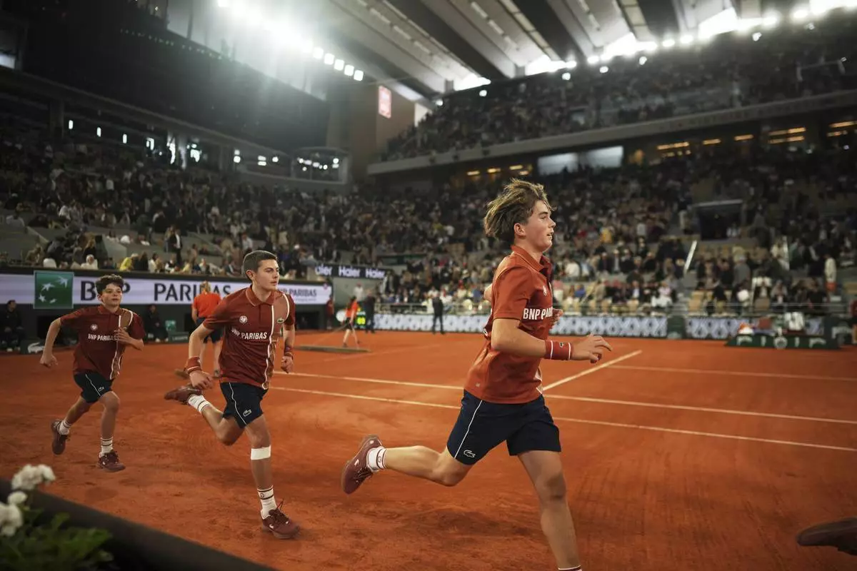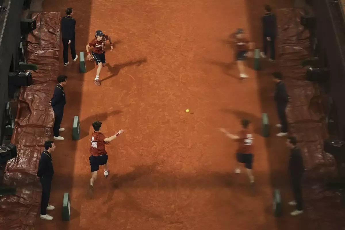 Ball boys run during a break at the semifinal match of the French Tennis Open between Aryna Sabalenka of Belarus and Poland's Iga Swiatek at the Roland-Garros stadium in Paris, Thursday, June 5, 2025. (AP Photo/Thibault Camus)