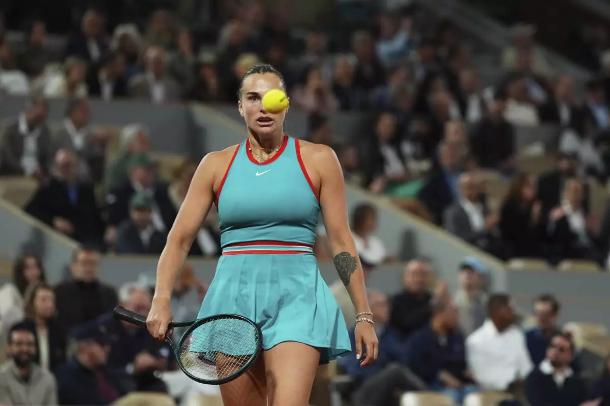 Aryna Sabalenka of Belarus reacts as she plays against Poland's Iga Swiatek during their semifinal match of the French Tennis Open at the Roland-Garros stadium in Paris, Thursday, June 5, 2025. (AP Photo/Lindsey Wasson)