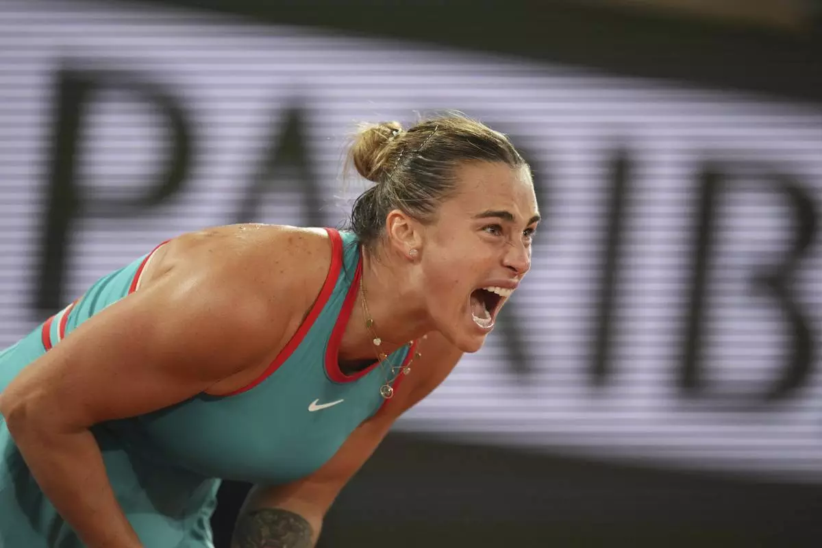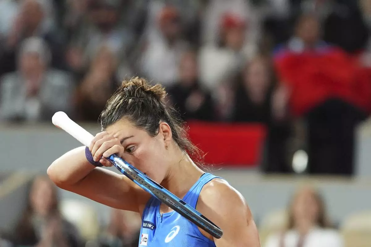 Aryna Sabalenka of Belarus reacts as she plays against Poland's Iga Swiatek during their semifinal match of the French Tennis Open at the Roland-Garros stadium in Paris, Thursday, June 5, 2025. (AP Photo/Thibault Camus)