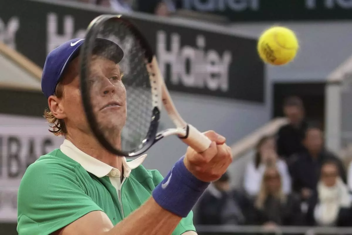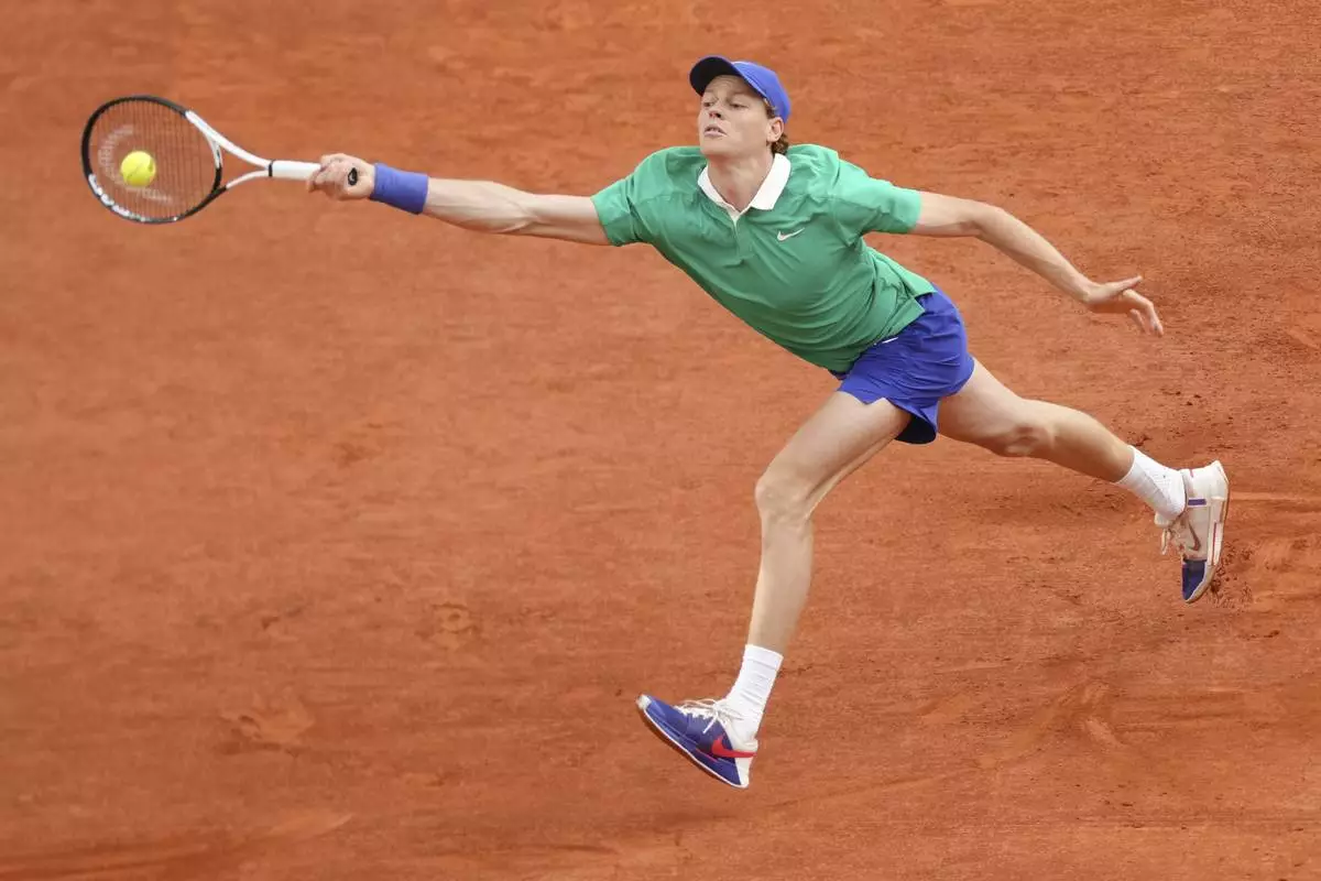 Italy's Jannik Sinner plays a shot against Serbia's Novak Djokovic during their semifinal match of the French Tennis Open at the Roland-Garros stadium in Paris, Friday, June 6, 2025. (AP Photo/Aurelien Morissard)