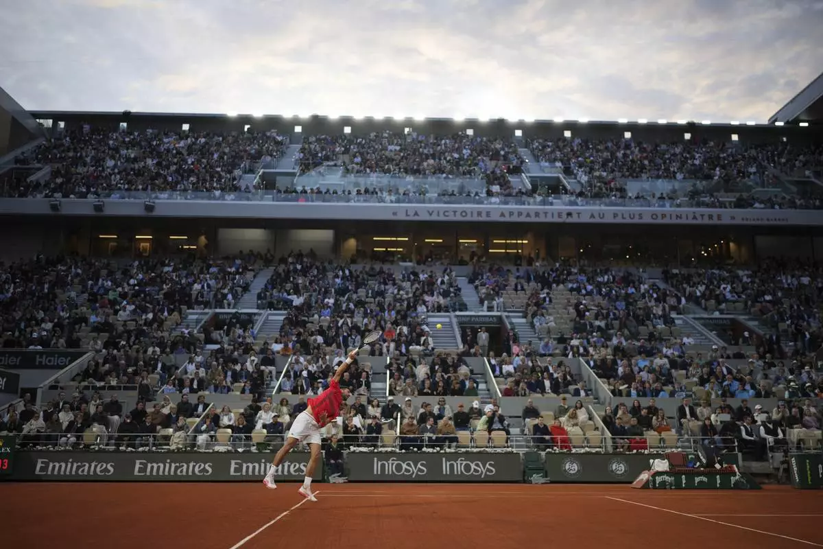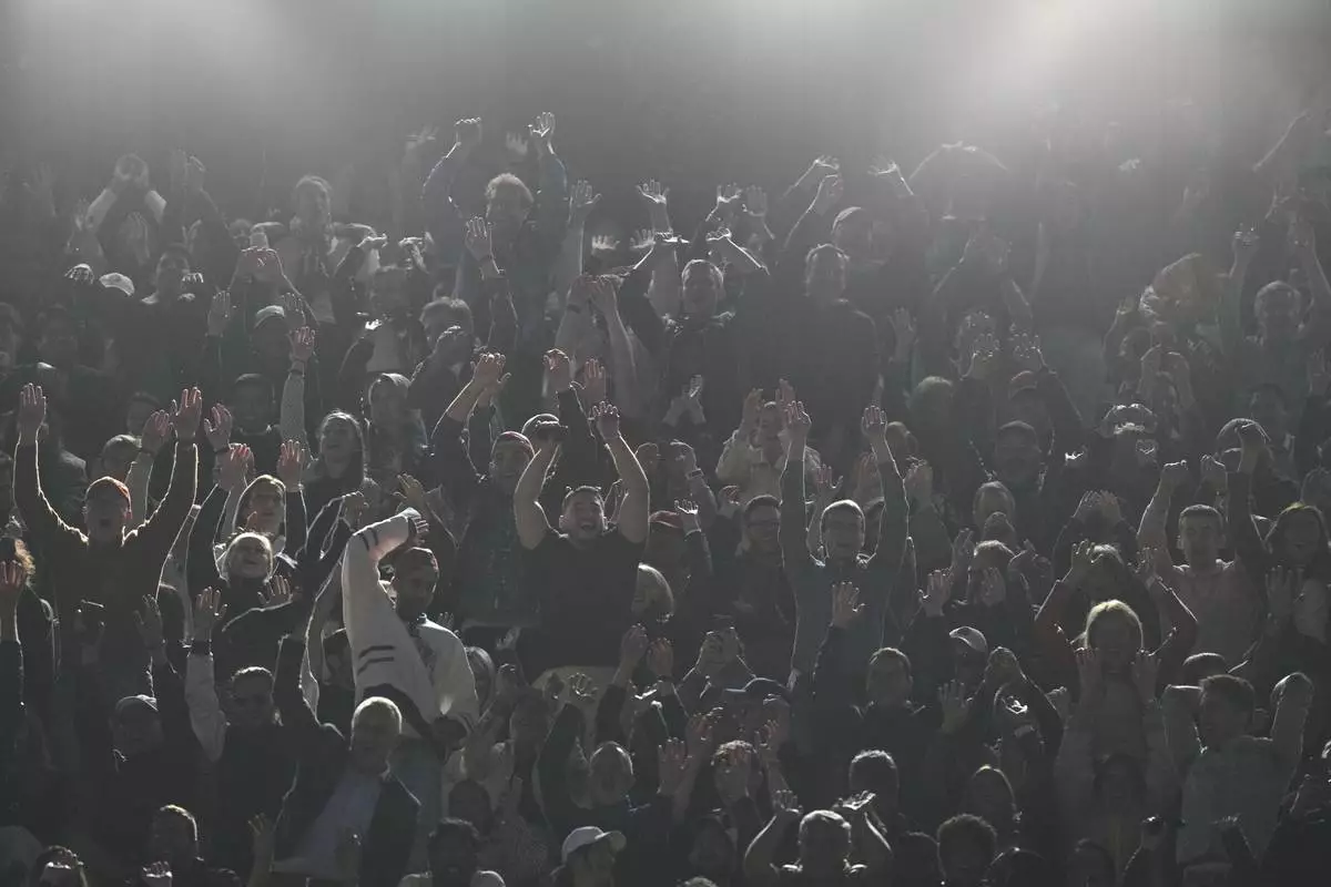 Spectators cheer during the semifinal match of the French Tennis Open between Italy's Jannik Sinner and Serbia's Novak Djokovic at the Roland-Garros stadium in Paris, Friday, June 6, 2025. (AP Photo/Thibault Camus)