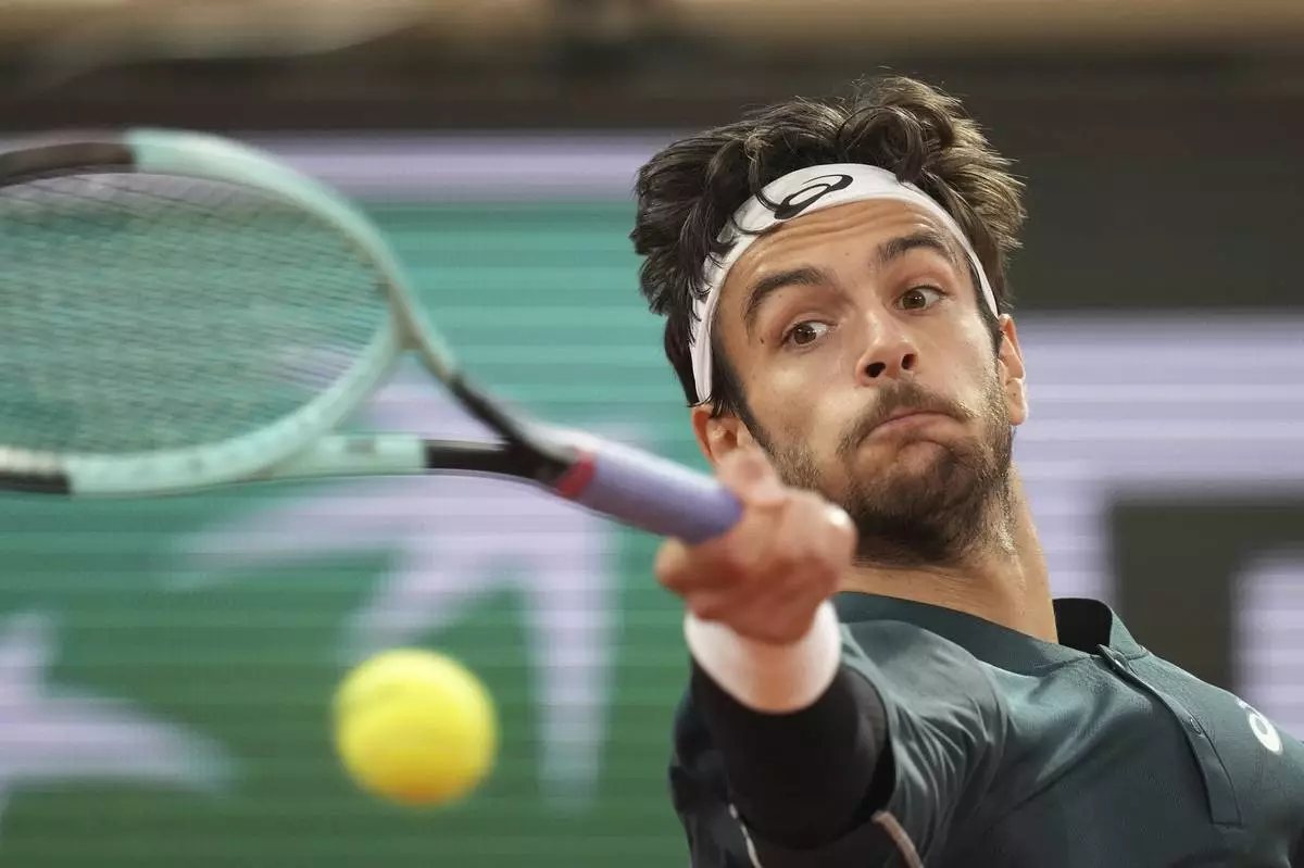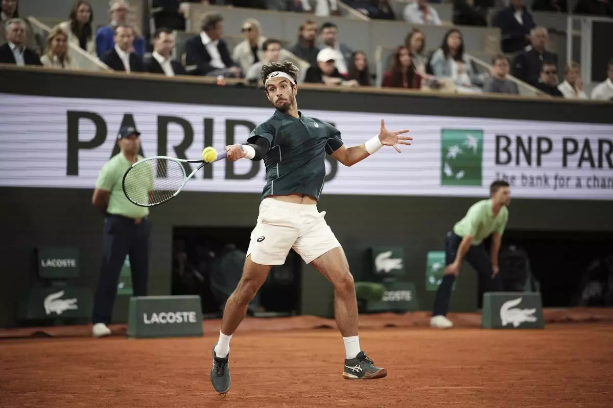 Italy's Lorenzo Musetti plays a shot against Spain's Carlos Alcaraz during their semifinal match of the French Tennis Open at the Roland-Garros stadium in Paris, Friday, June 6, 2025. (AP Photo/Lindsey Wasson)