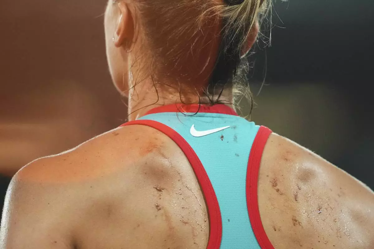 The clay stuck to the back of Belarus' Aryna Sabalenka after a fall during the semifinal match of the French Tennis Open against Poland's Iga Swiatek at the Roland-Garros stadium in Paris, Thursday, June 5, 2025. (AP Photo/Lindsey Wasson)