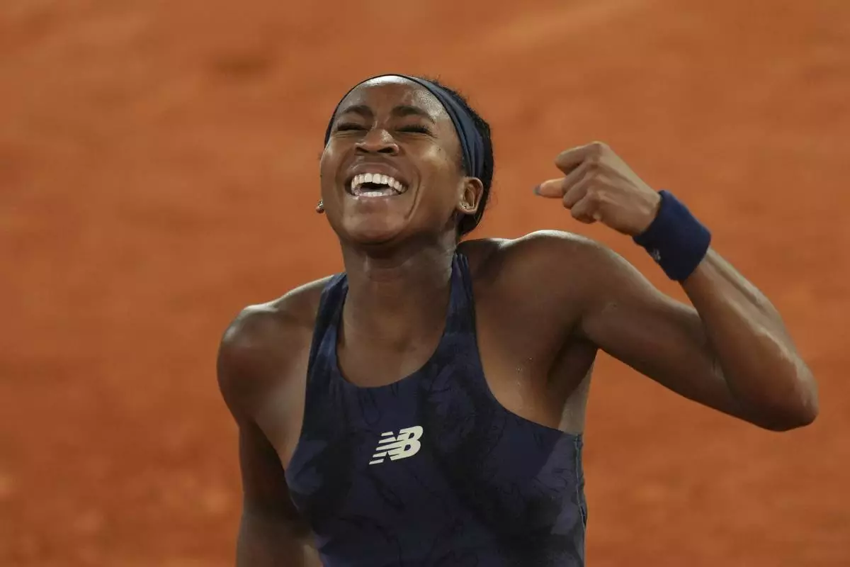 Coco Gauff of the U.S. celebrates as she won the semifinal match of the French Tennis Open against France's Lois Boisson at the Roland-Garros stadium in Paris, Thursday, June 5, 2025. (AP Photo/Aurelien Morissard)