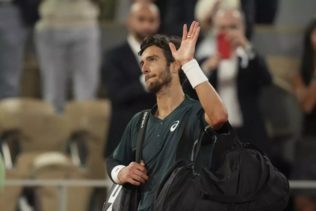 Italy's Lorenzo Musetti reacts as he leaves after the semifinal match of the French Tennis Open against Spain's Carlos Alcaraz at the Roland-Garros stadium in Paris, Friday, June 6, 2025. (AP Photo/Christophe Ena)