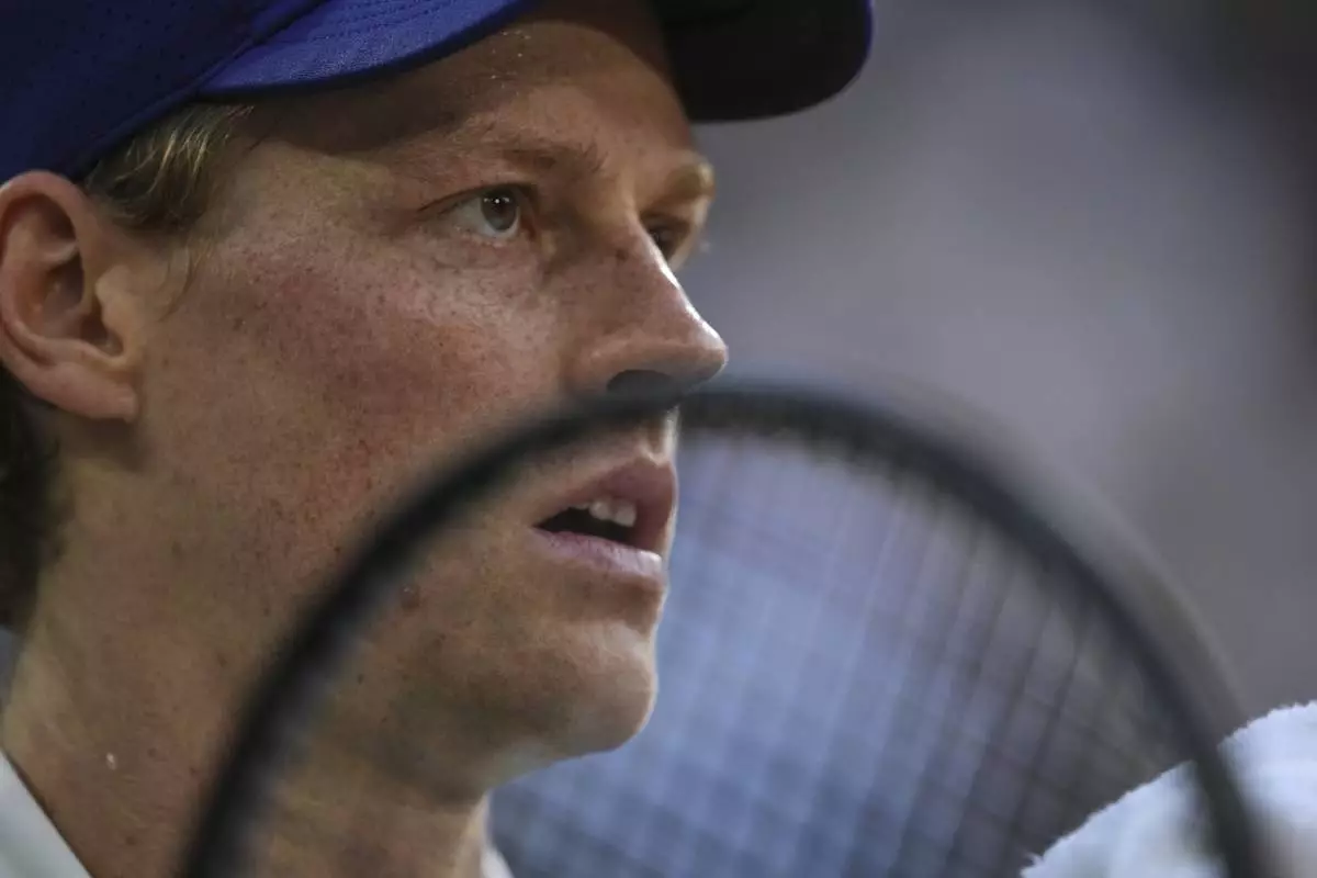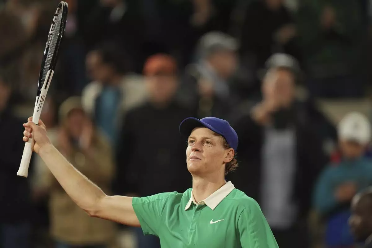 Italy's Jannik Sinner reacts as he plays against Serbia's Novak Djokovic during their semifinal match of the French Tennis Open at the Roland-Garros stadium in Paris, Friday, June 6, 2025. (AP Photo/Aurelien Morissard)