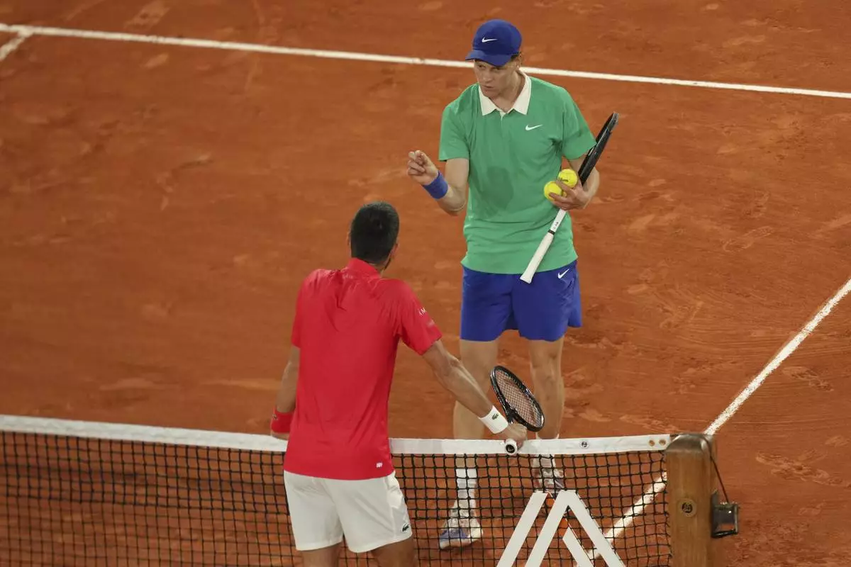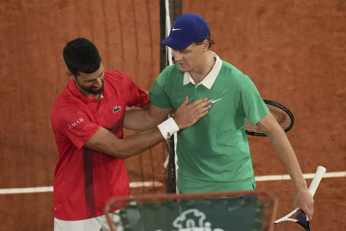 Winner Italy's Jannik Sinner, right, and Serbia's Novak Djokovic greet each other after their semifinal match of the French Tennis Open at the Roland-Garros stadium in Paris, Friday, June 6, 2025. (AP Photo/Christophe Ena)