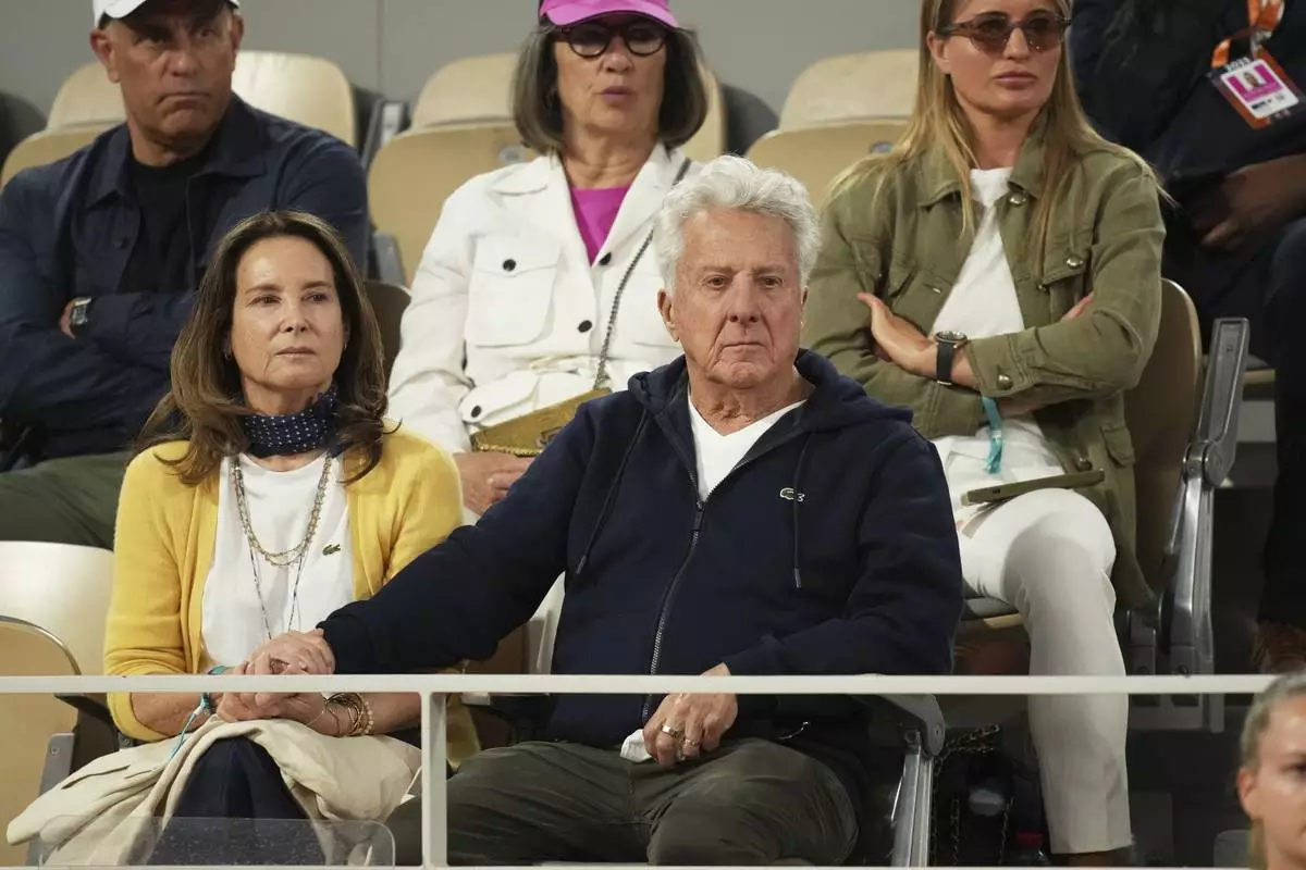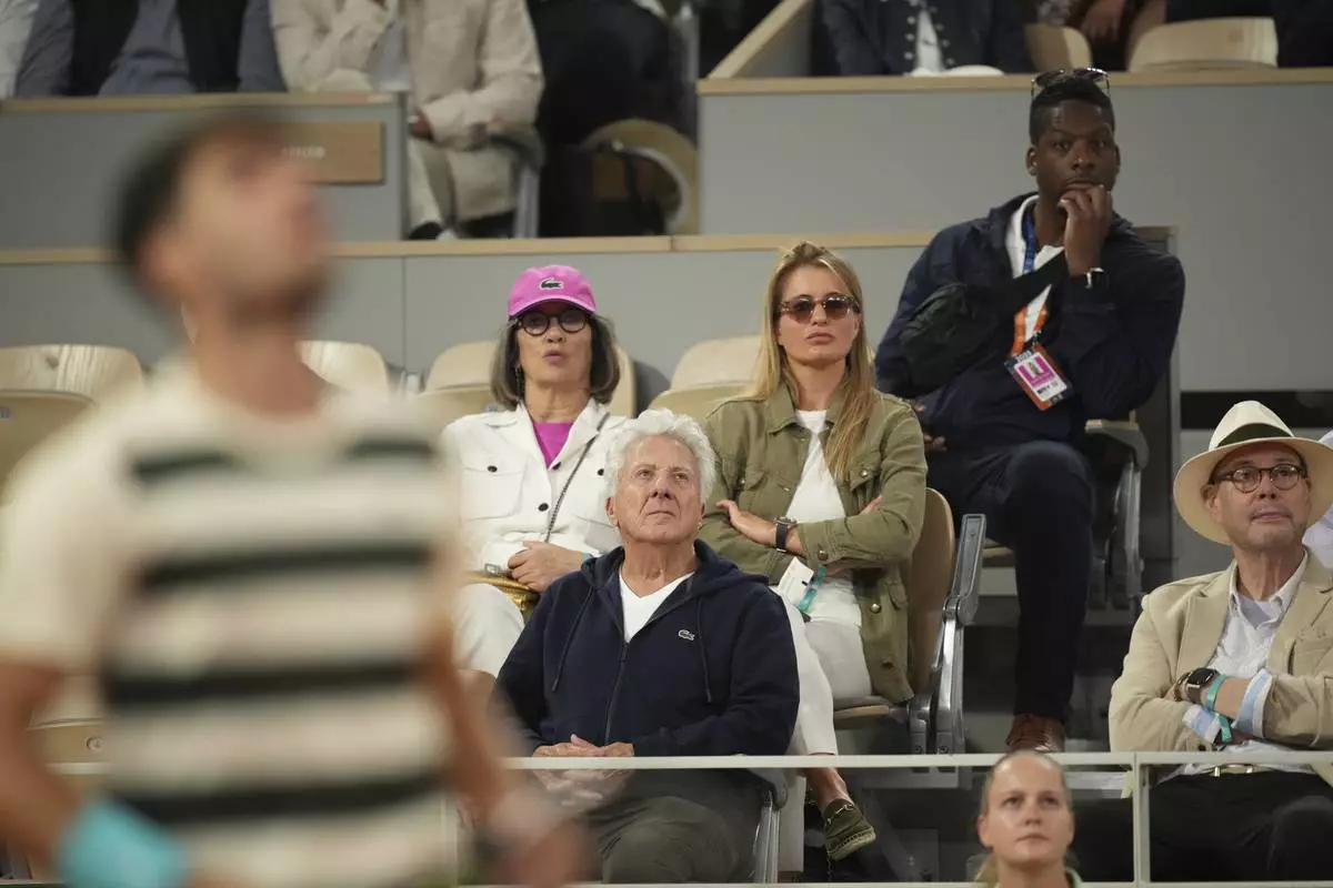 Actor Dustin Hoffman and his wife Lisa watch the semifinal match of the French Tennis Open between Italy's Lorenzo Musetti and Spain's Carlos Alcaraz at the Roland-Garros stadium in Paris, Friday, June 6, 2025. (AP Photo/Christophe Ena)
