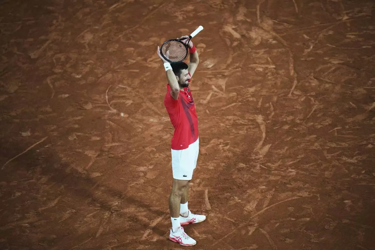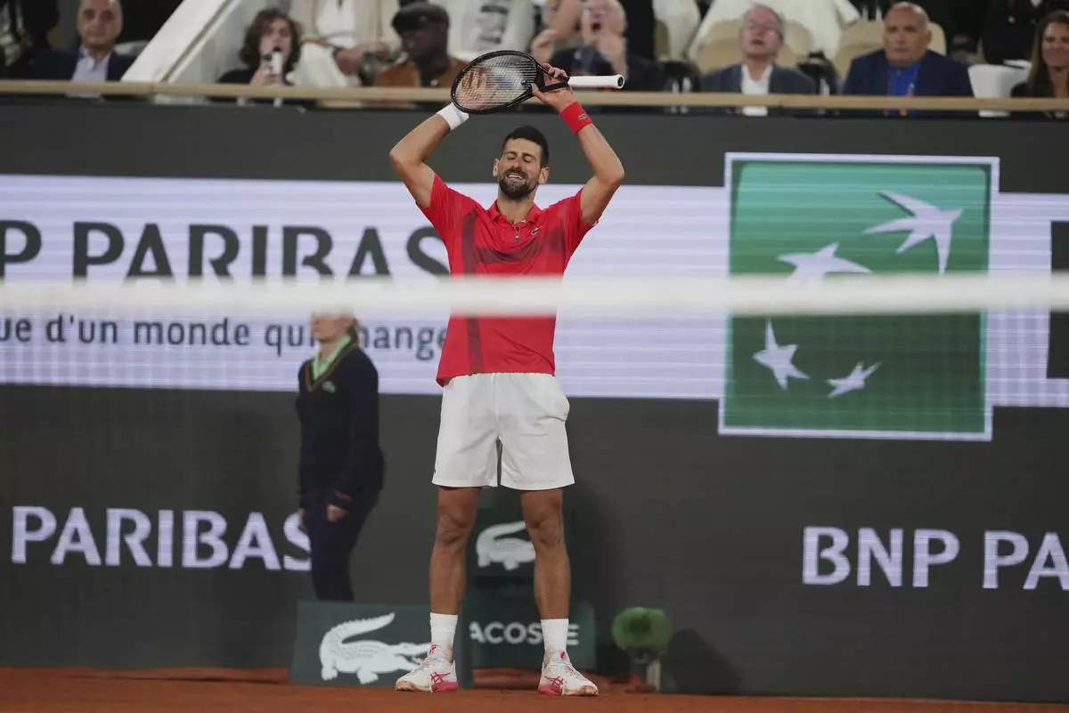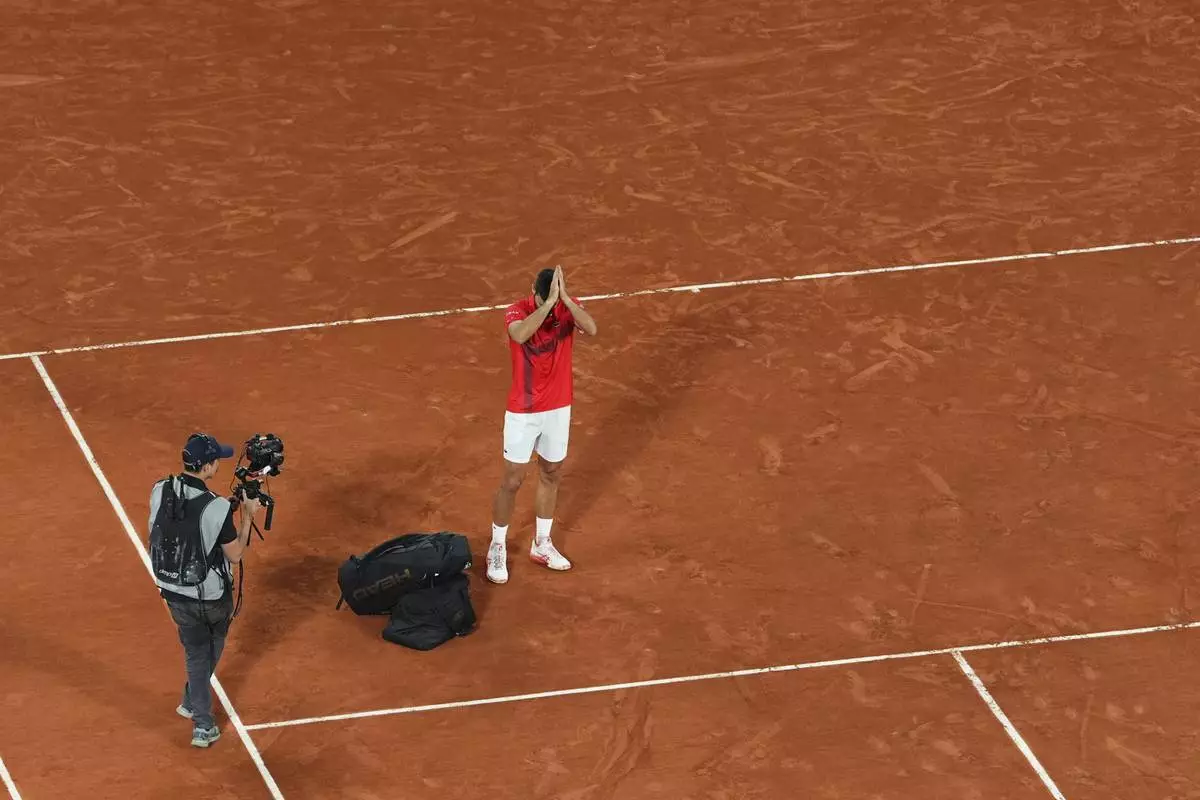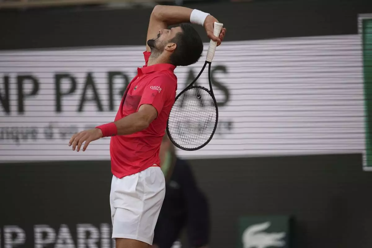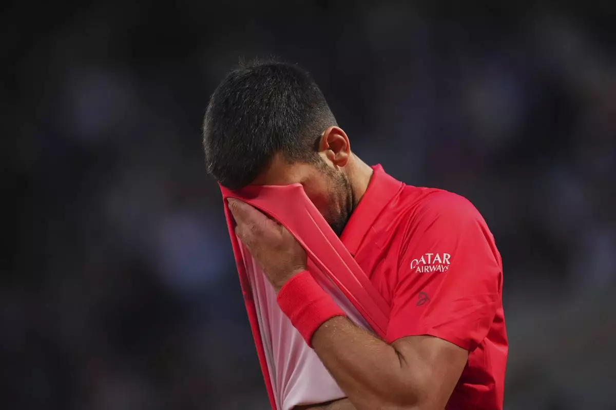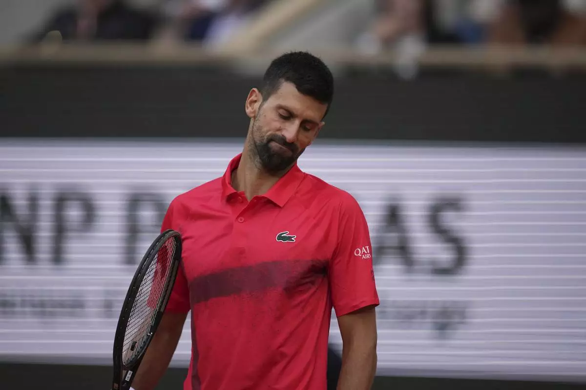 Serbia's Novak Djokovic gestures as he leaves the semifinal match of the French Tennis Open against Italy's Jannik Sinner at the Roland-Garros stadium in Paris, Friday, June 6, 2025. (AP Photo/Lindsey Wasson)