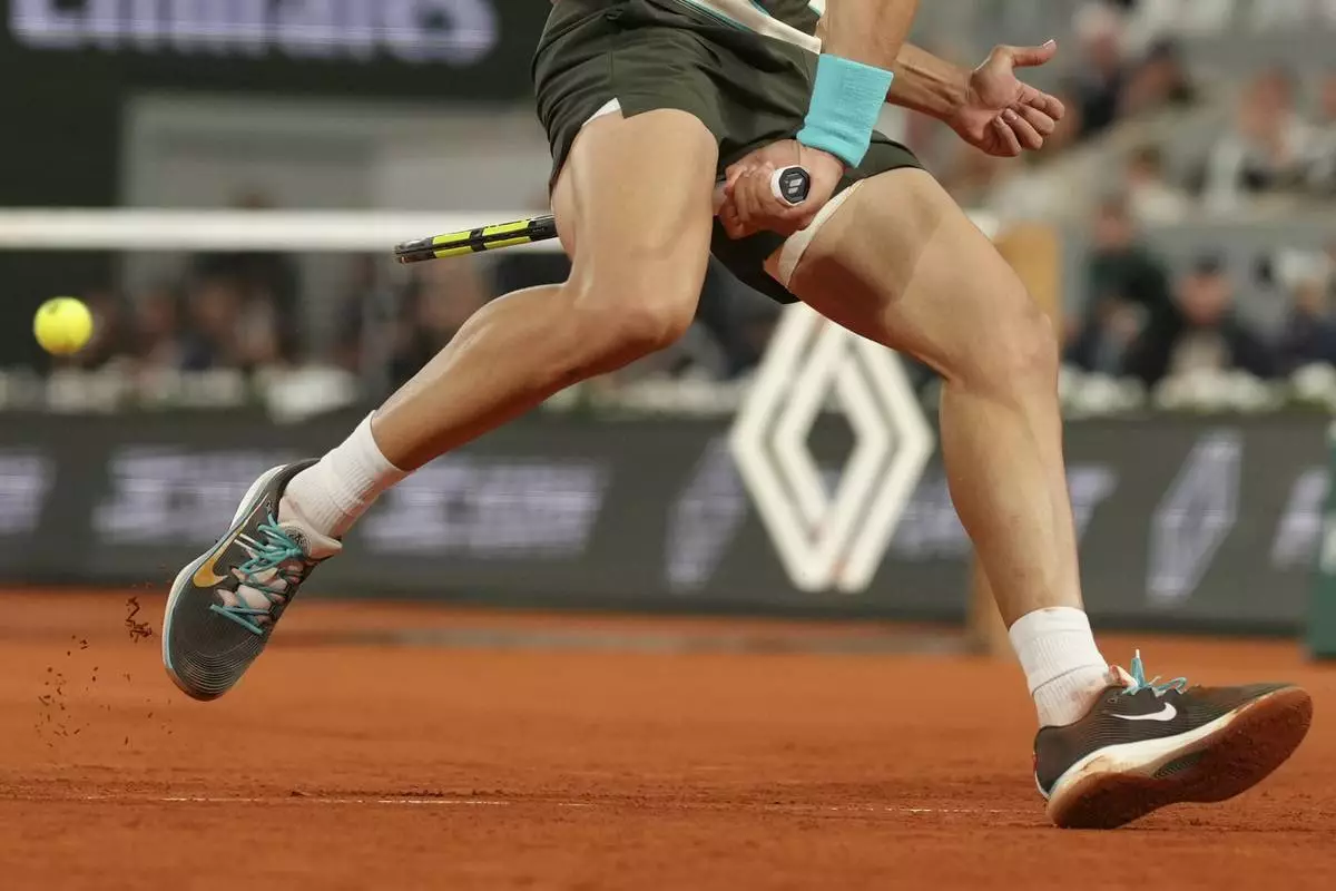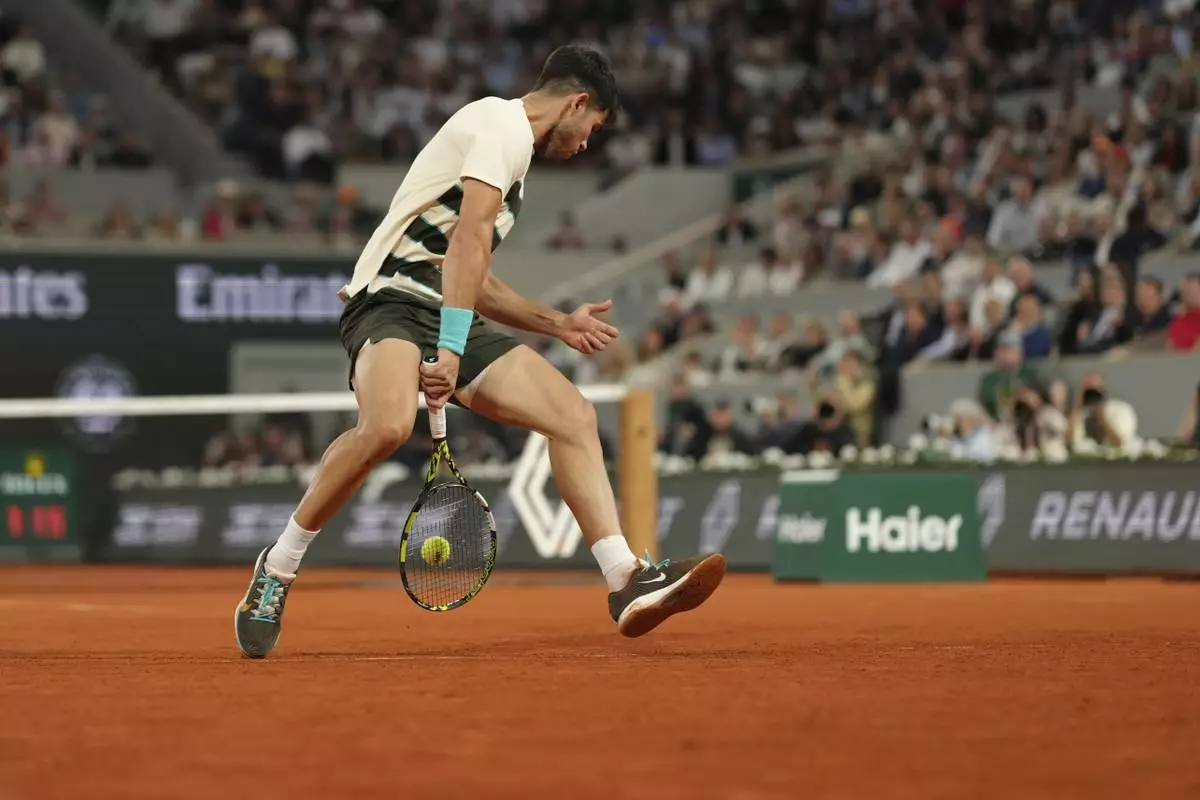 Spain's Carlos Alcaraz plays a shot against Italy's Lorenzo Musetti during their semifinal match of the French Tennis Open at the Roland-Garros stadium in Paris, Friday, June 6, 2025. (AP Photo/Aurelien Morissard)