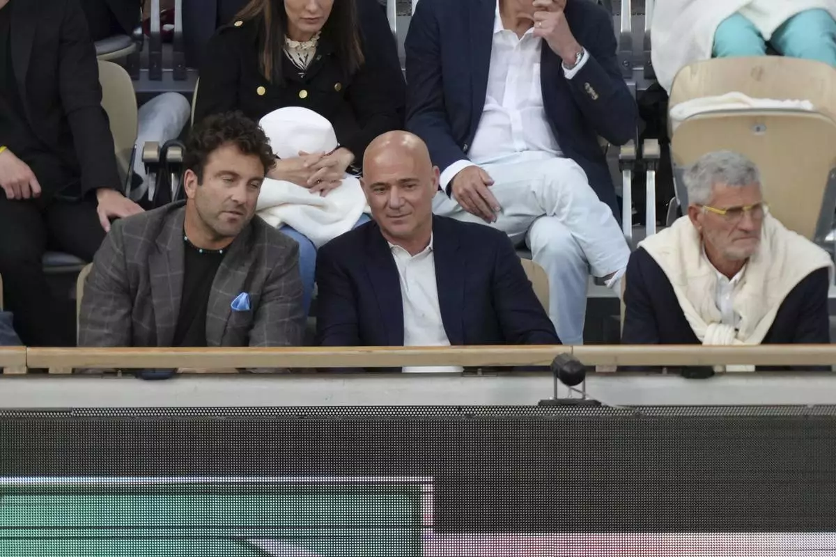 Former tennis star Andre Agassi, centre, watches the semifinal match of the French Tennis Open between Italy's Jannik Sinner and Serbia's Novak Djokovic at the Roland-Garros stadium in Paris, Friday, June 6, 2025. (AP Photo/Aurelien Morissard)