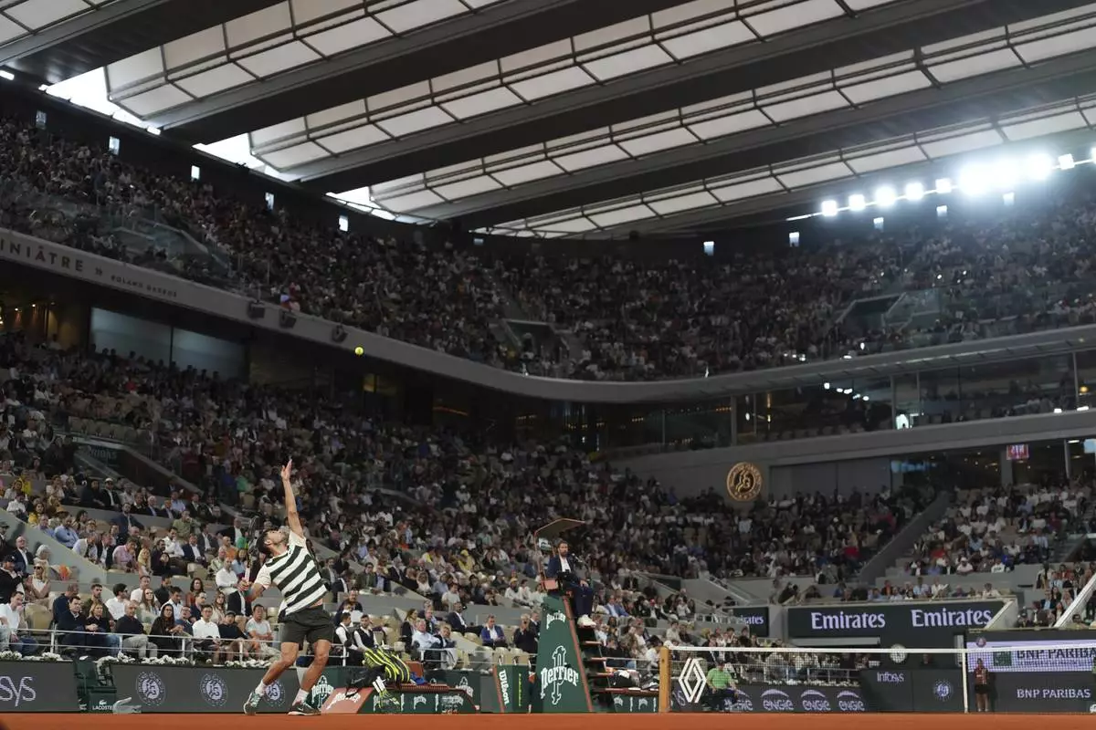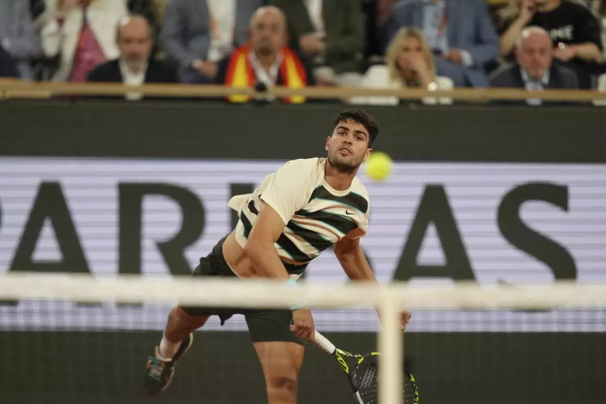 Spain's Carlos Alcaraz serves against Italy's Lorenzo Musetti during their semifinal match of the French Tennis Open at the Roland-Garros stadium in Paris, Friday, June 6, 2025. (AP Photo/Lindsey Wasson)