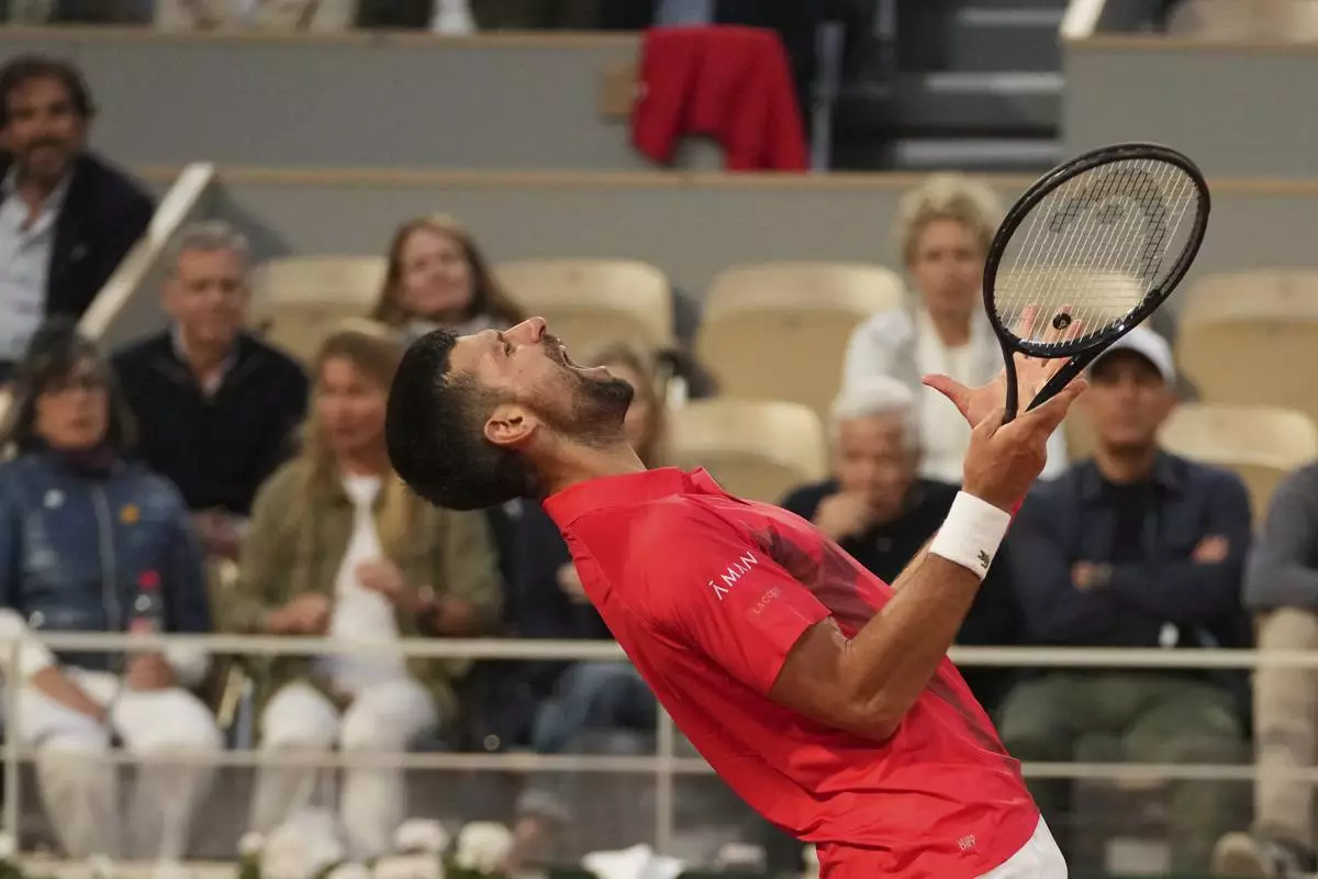 Serbia's Novak Djokovic reacts during the semifinal match of the French Tennis Open against Italy's Jannik Sinner at the Roland-Garros stadium in Paris, Friday, June 6, 2025. (AP Photo/Lindsey Wasson)
