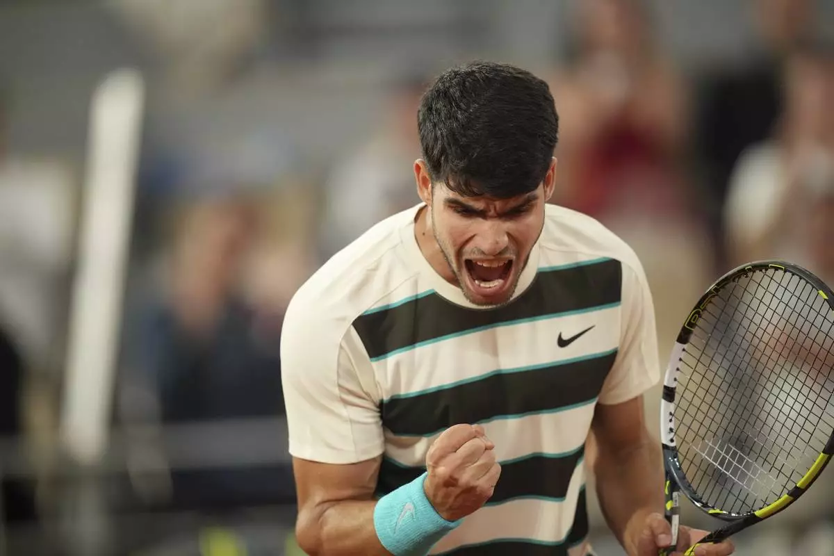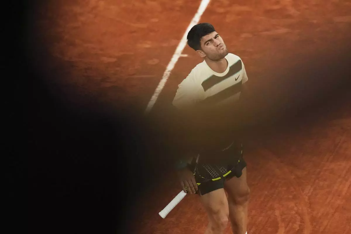 Spain's Carlos Alcaraz reacts as he plays against Italy's Lorenzo Musetti during their semifinal match of the French Tennis Open at the Roland-Garros stadium in Paris, Friday, June 6, 2025. (AP Photo/Thibault Camus)