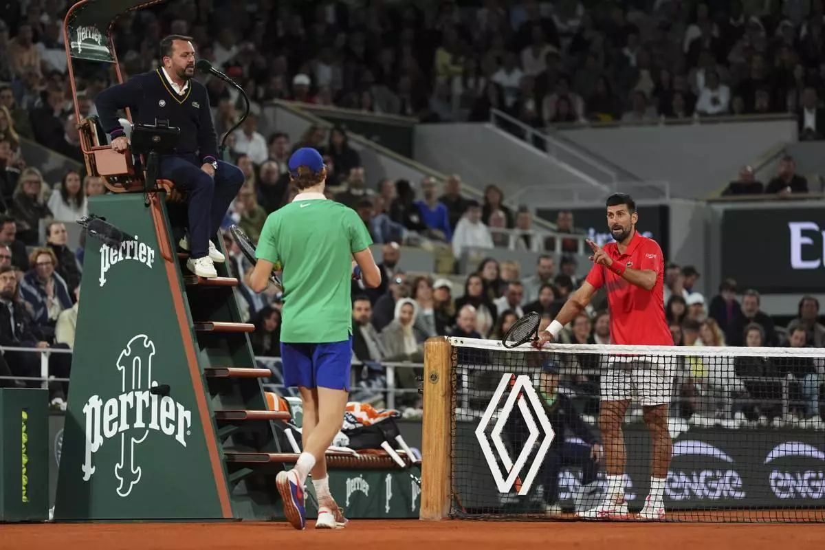 Serbia's Novak Djokovic talks with chair umpire Damien Dumusois during the semifinal match of the French Tennis Open against Italy's Jannik Sinner at the Roland-Garros stadium in Paris, Friday, June 6, 2025. (AP Photo/Lindsey Wasson)