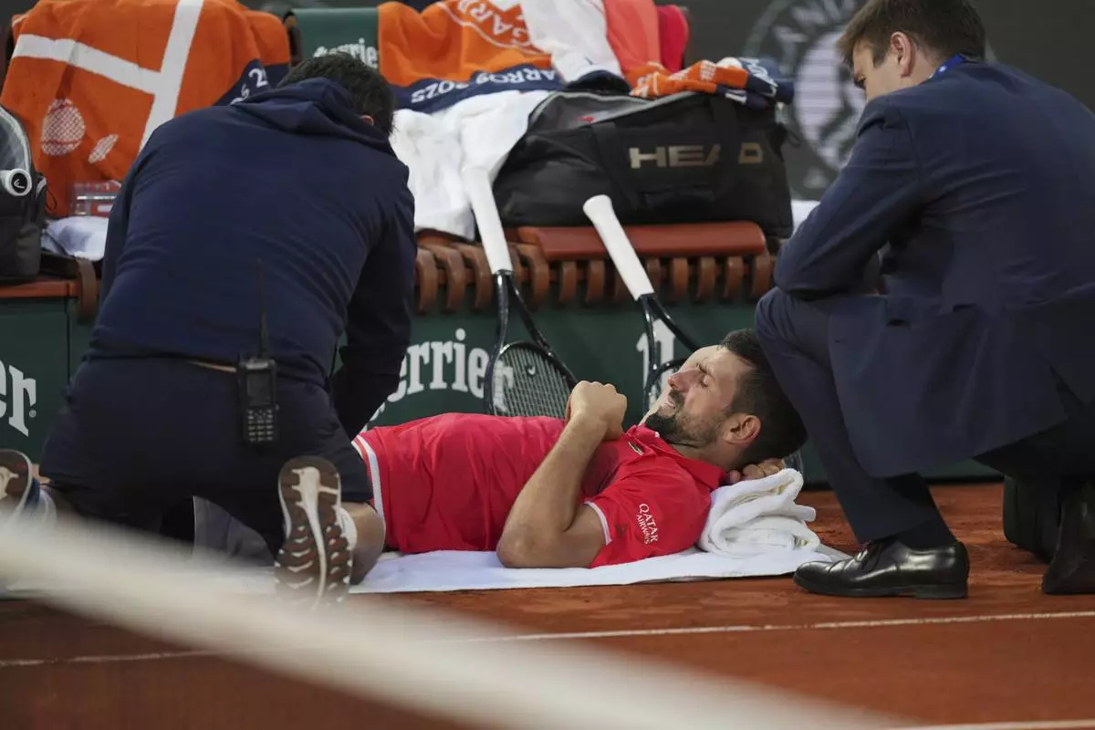 Serbia's Novak Djokovic receives medical assistance during a break at the semifinal match of the French Tennis Open at the Roland-Garros against Italy's Jannik Sinner stadium in Paris, Friday, June 6, 2025. (AP Photo/Thibault Camus)
