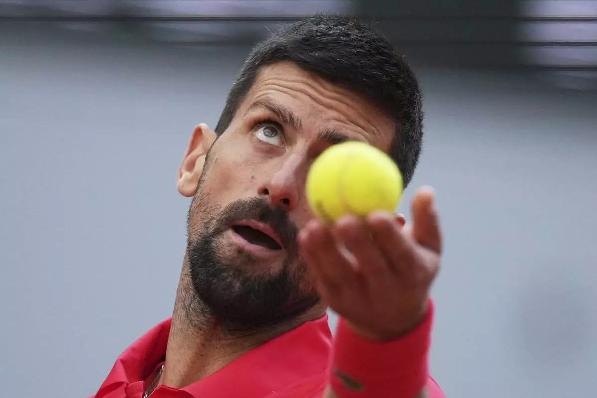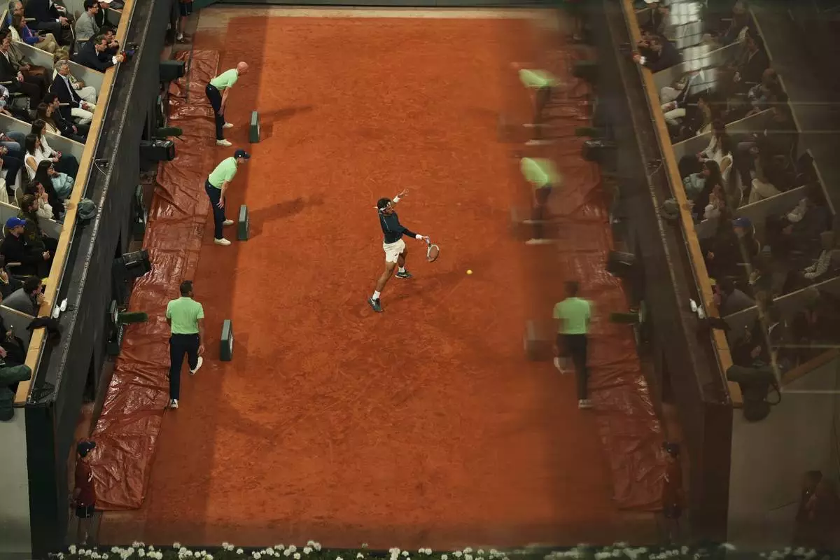 Serbia's Novak Djokovic serves against Italy's Jannik Sinner during their semifinal match of the French Tennis Open at the Roland-Garros stadium in Paris, Friday, June 6, 2025. (AP Photo/Christophe Ena)