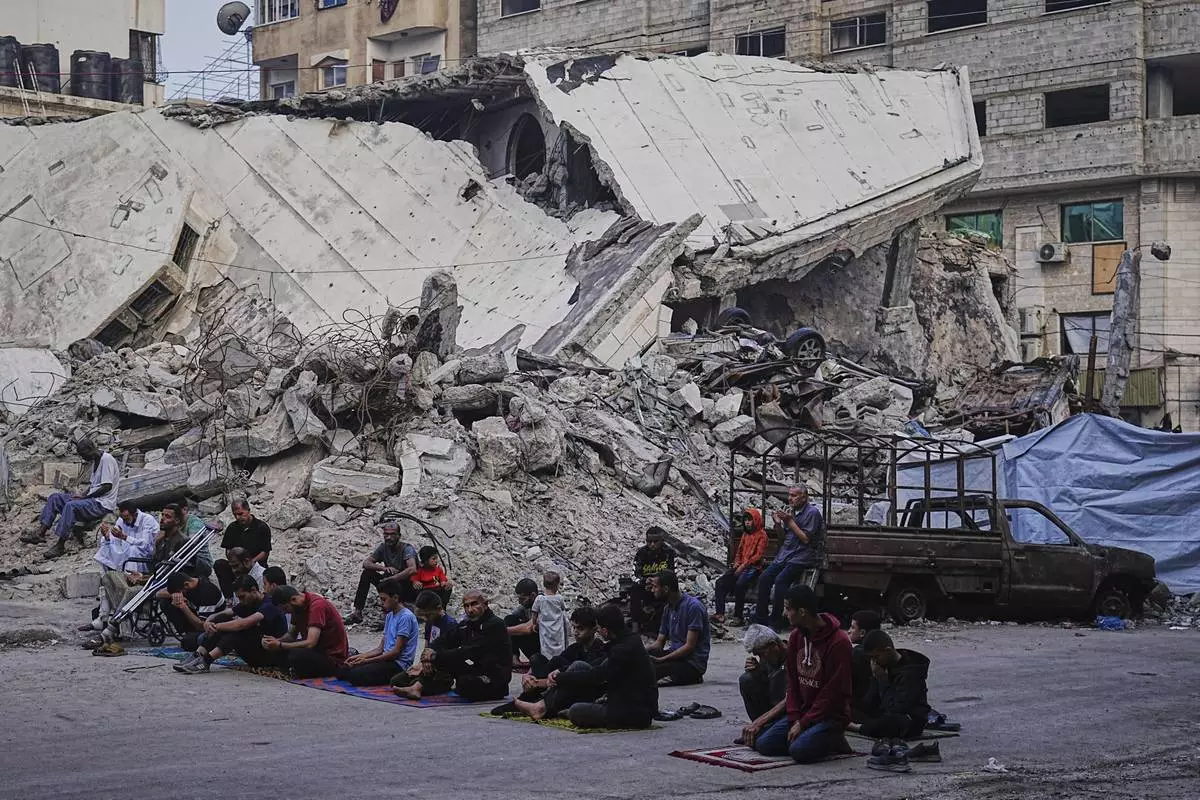Palestinians gather for Eid al-Adha prayers beside the ruins of Al-Kanz mosque destroyed by Israeli bombardment, in Gaza City on Friday, June 6, 2025. (AP Photo/Jehad Alshrafi)