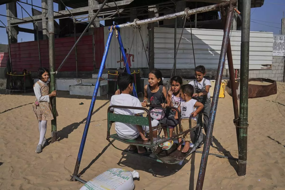 Displaced Palestinian children play on a swing at a tent camp on the first day of Eid al-Adha in Khan Younis, Gaza, Friday, June 6, 2025. (AP Photo/Abdel Kareem Hana)