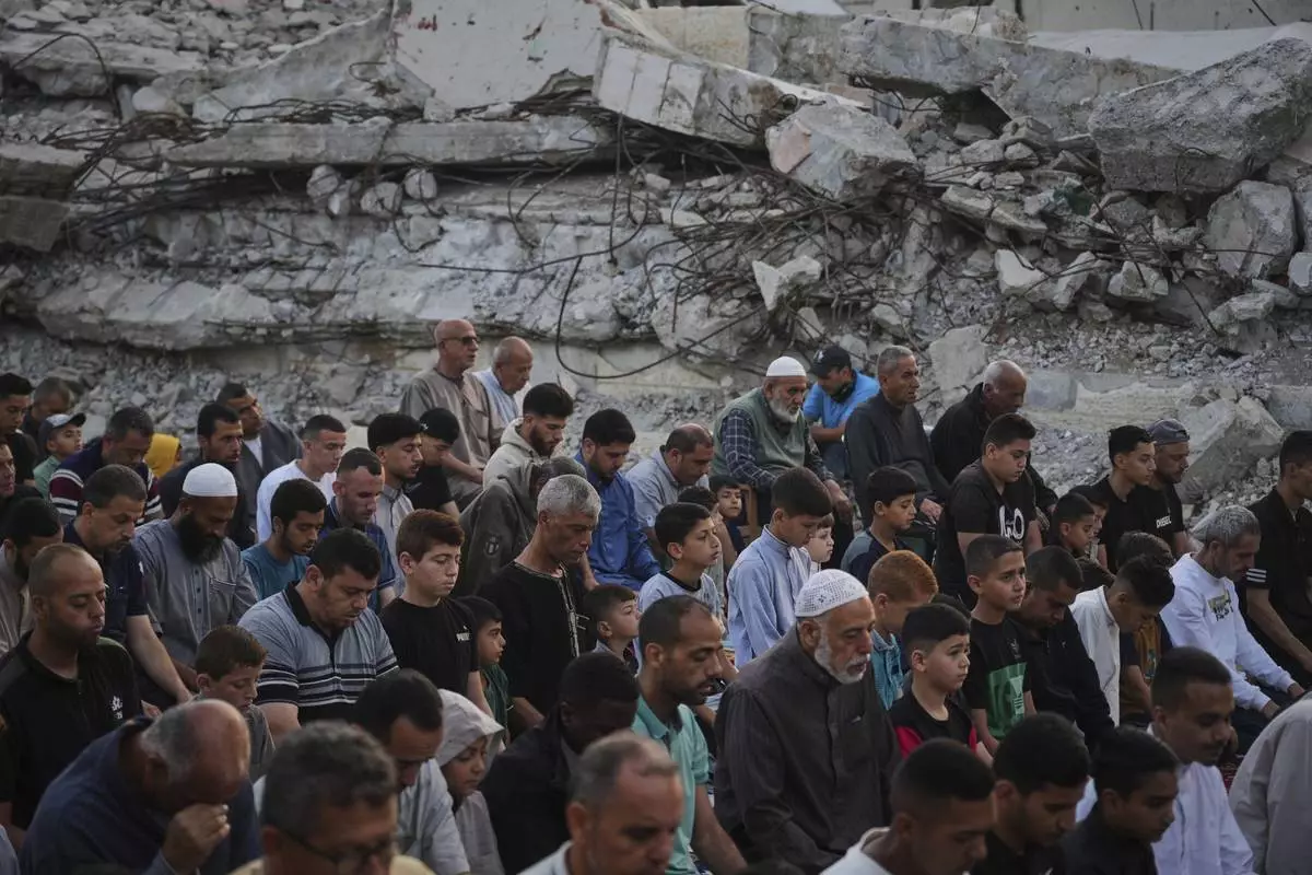 Palestinians gather for Eid al-Adha prayers beside the ruins of a mosque destroyed by Israeli bombardment, in Deir al-Balah, Gaza on Friday, June 6, 2025. (AP Photo/Abdel Kareem Hana)