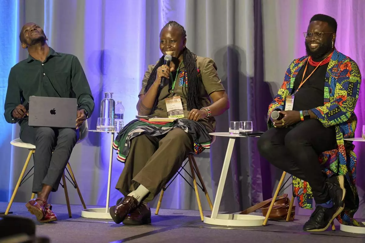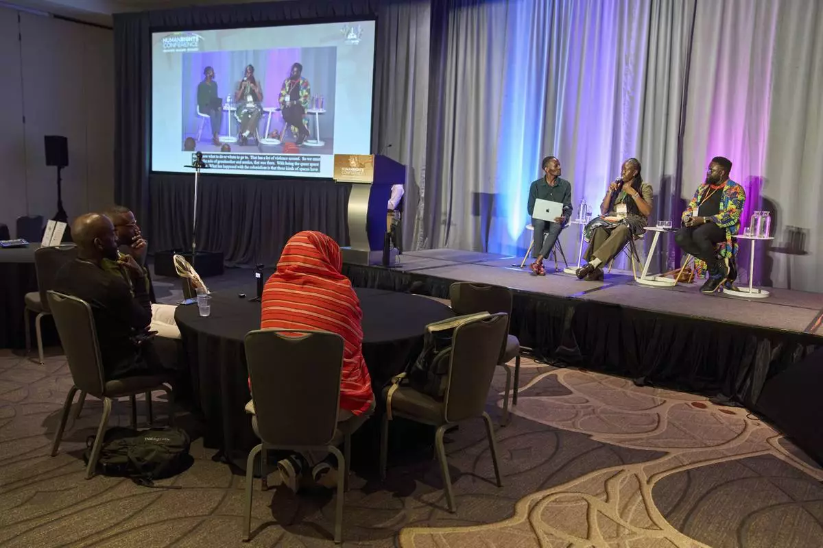 Steven Muleme, of Uganda, Executive Director of Visual Echoes for Human Rights Advocacy (VEHRA), Essy Adhiambo, of Kenya, founder and Executive Director of INEND, a human rights organization for gender minorities in Kenya, and Gilbert Mitullah, of Kenya, Executive Director of the Alliance for Strategic Minority Leadership, attend a forum about the African Continent, Wednesday, June 4, 2025, during the Human Rights Conference at World Pride, in Washington. (AP Photo/Jacquelyn Martin)