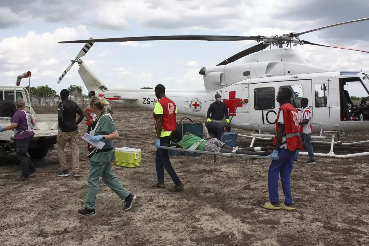 FILE - Medical staff with the International Committee of the Red Cross (ICRC) and South Sudan Red Cross, move a wounded patient to an ambulance in Akobo, South Sudan, Saturday, May 24, 2025. (AP Photo/Joseph Falzetta, file)