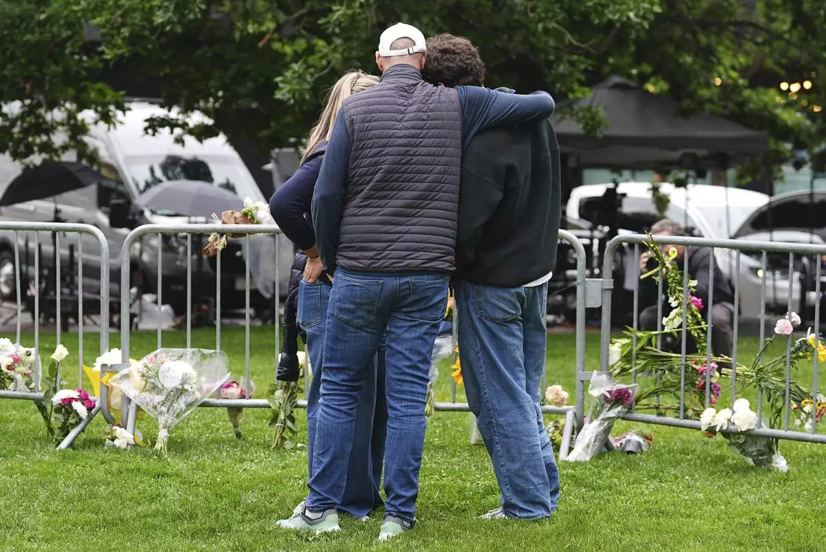 As Jennifer Dechtman, back, looks on, her husband Evan, front left, consoles his son, Isaac, right, at a makeshift memorial for victims of an attack outside of the Boulder County, Colo., courthouse Tuesday, June 3, 2025, in Boulder, Colo. (AP Photo/David Zalubowski)