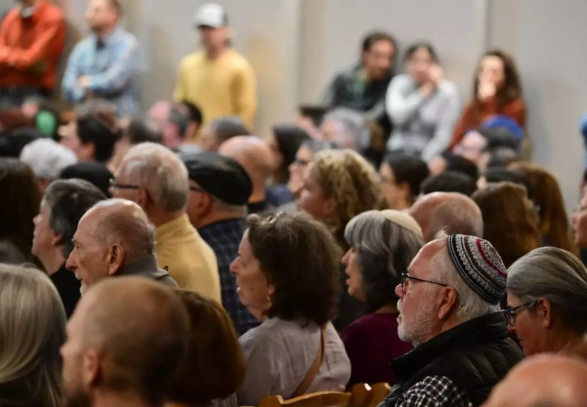 Attendees listen to speakers during a community vigil at the Boulder Jewish Community Center, Wednesday, June 4, 2025, in Boulder, Colo. (Andy Cross/The Denver Post via AP, Pool)