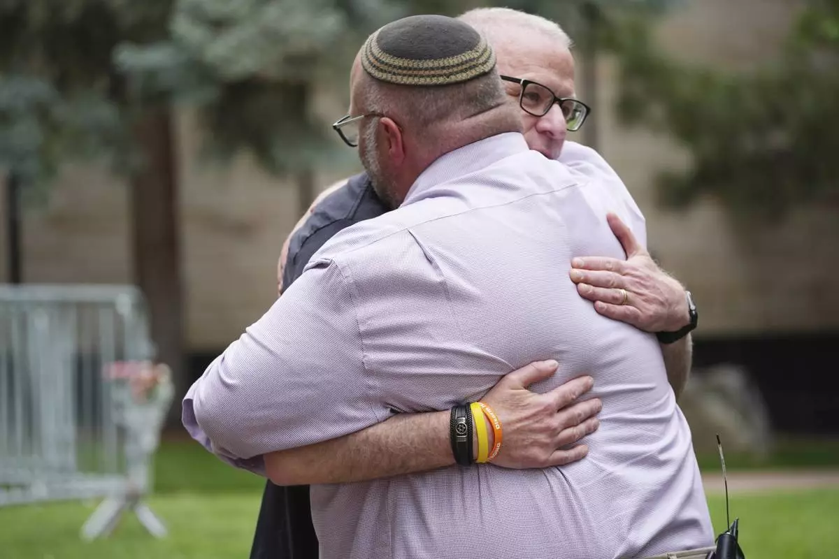 Rabbi Fred Greene of Congregation Har Hashem, front, hugs a man outside of the Boulder County, Colo., courthouse after Sunday's attack, Monday, June 2, 2025, in Boulder, Colo. (AP Photo/David Zalubowski)