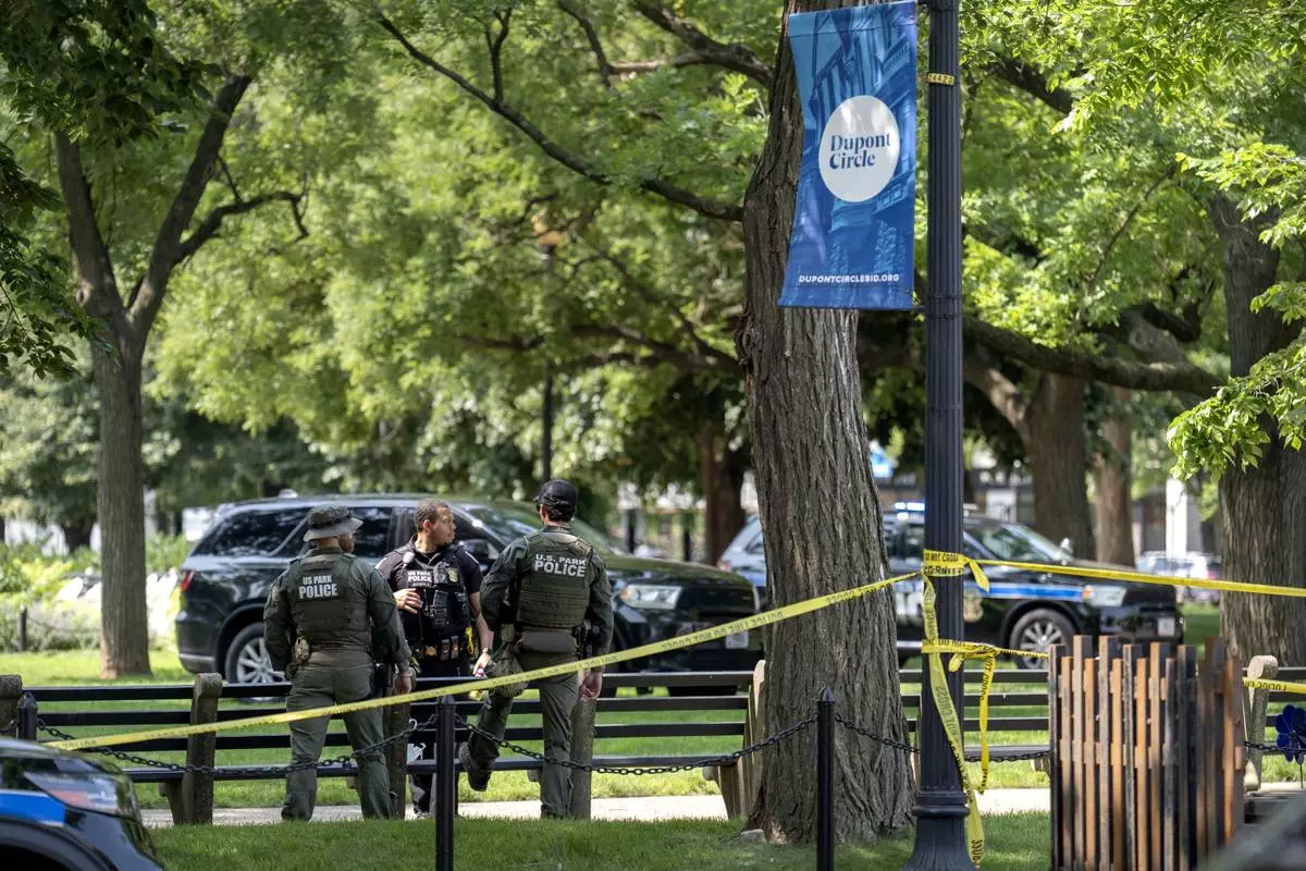 U.S. Park Police stand by as workers put up fencing around Dupont Circle ahead of the World Pride Parade, Friday, June 6, 2025, in Washington. (AP Photo/Mark Schiefelbein)