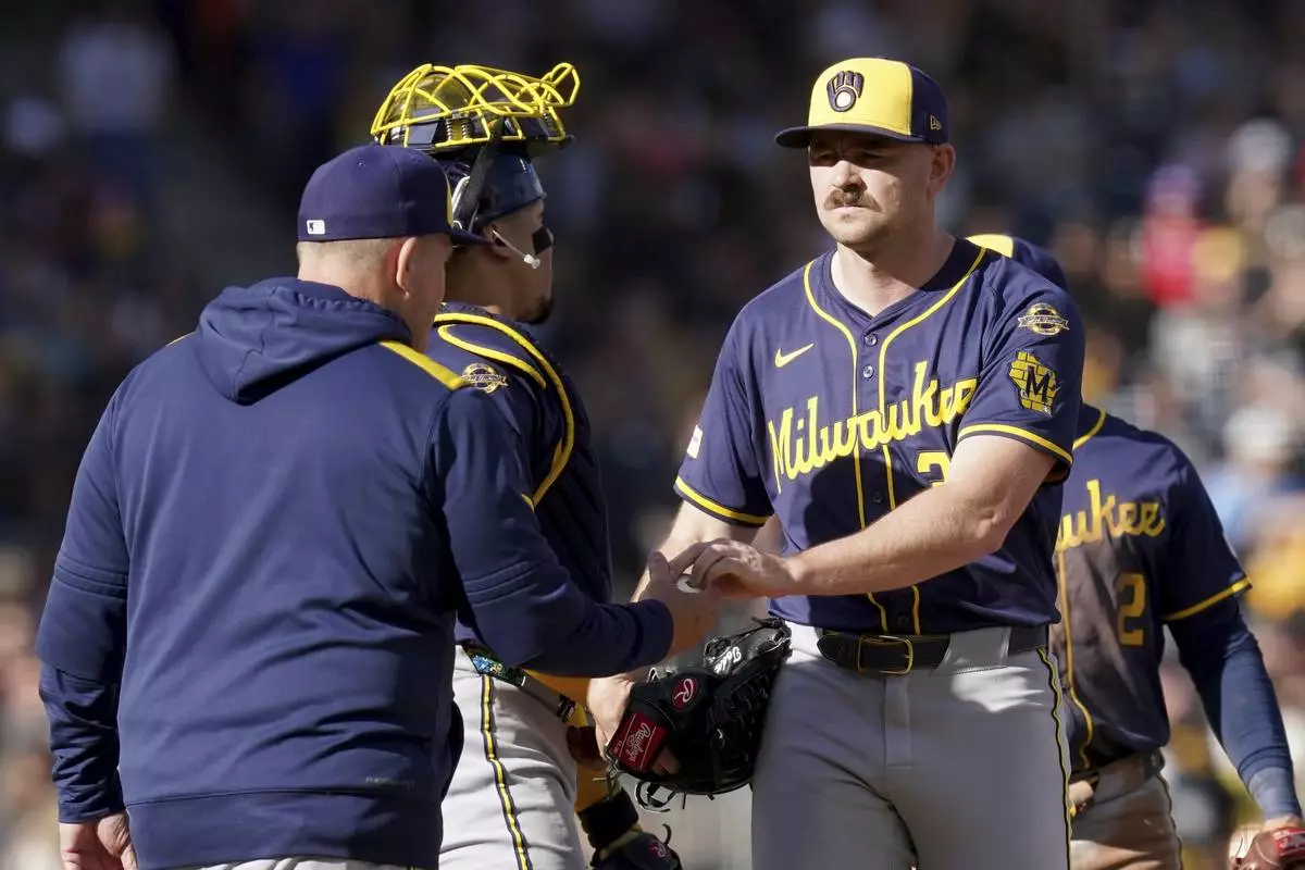 Milwaukee Brewers pitcher Tyler Alexander, right, hands the ball to manager Pat Murphy, left, during the seventh inning of a baseball game against the Pittsburgh Pirates, Saturday, May 24, 2025, in Pittsburgh. (AP Photo/Matt Freed)