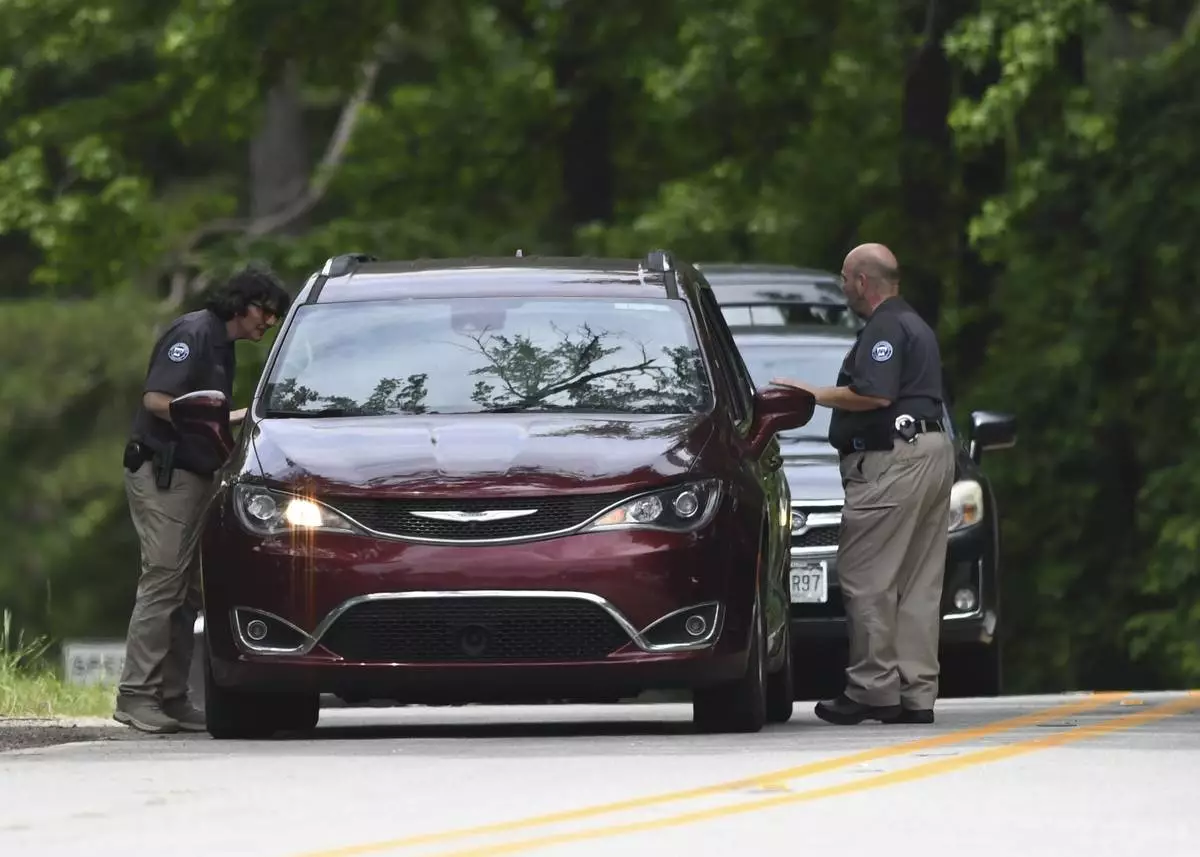 Police set up checkpoints looking for escaped prisoner Grant Hardin, Thursday, May 29, 2025, near downtown Calico Rock, Ark. (AP Photo/Nicholas Ingram)